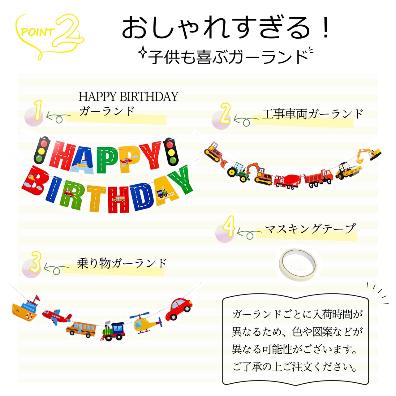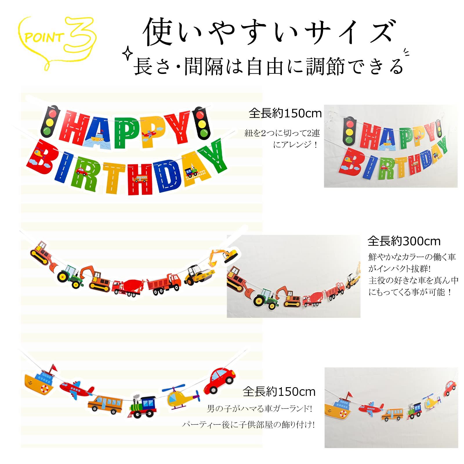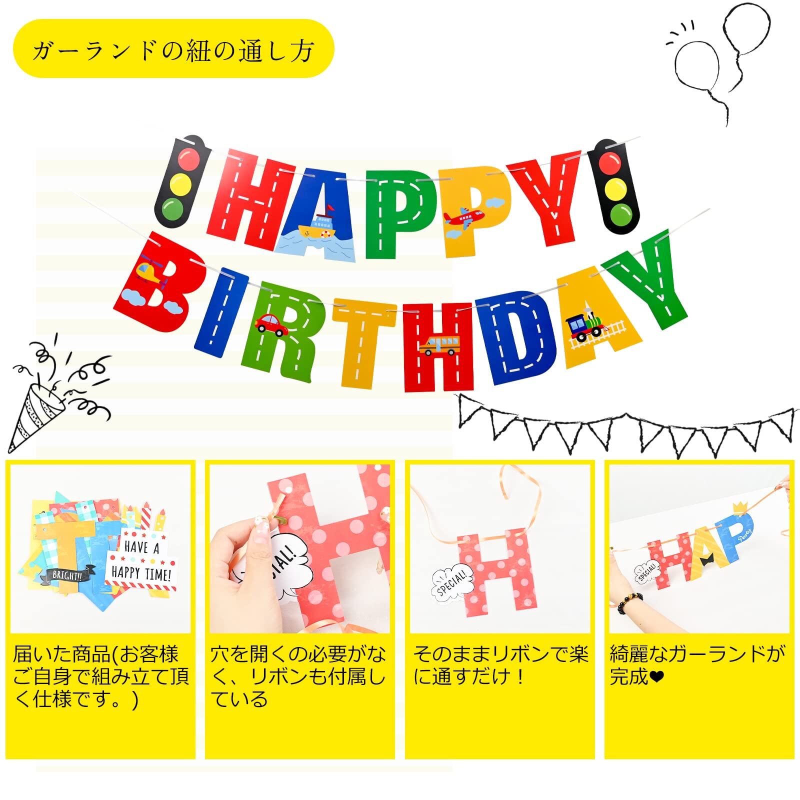 セット内容:HAPPY BIRTHDAYガーランド×1、乗り物ガーランド×1、工事車両ガーランド×1、マスキングテープ×1。糸が細く絡ありやすいので、取り出す際ご注意ください。ガーランドごとに入荷時間が異なるため、色や図案などが異なる可能性がございます。ご了承の上ご注文ください。(対象年齢6+以上)