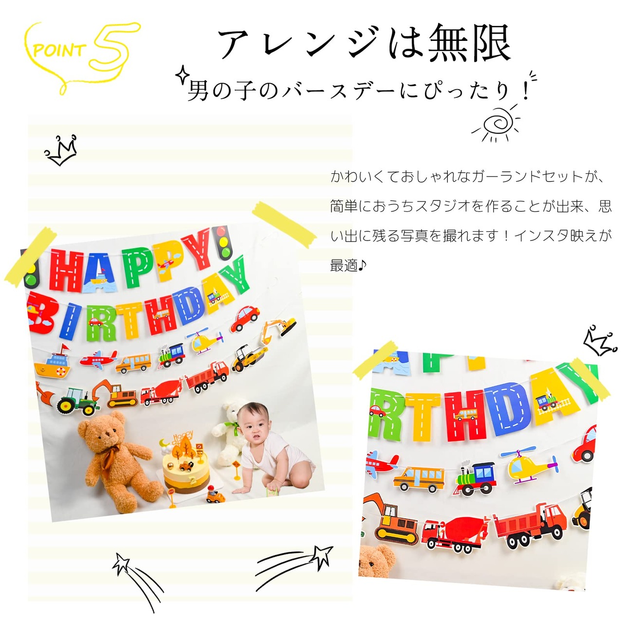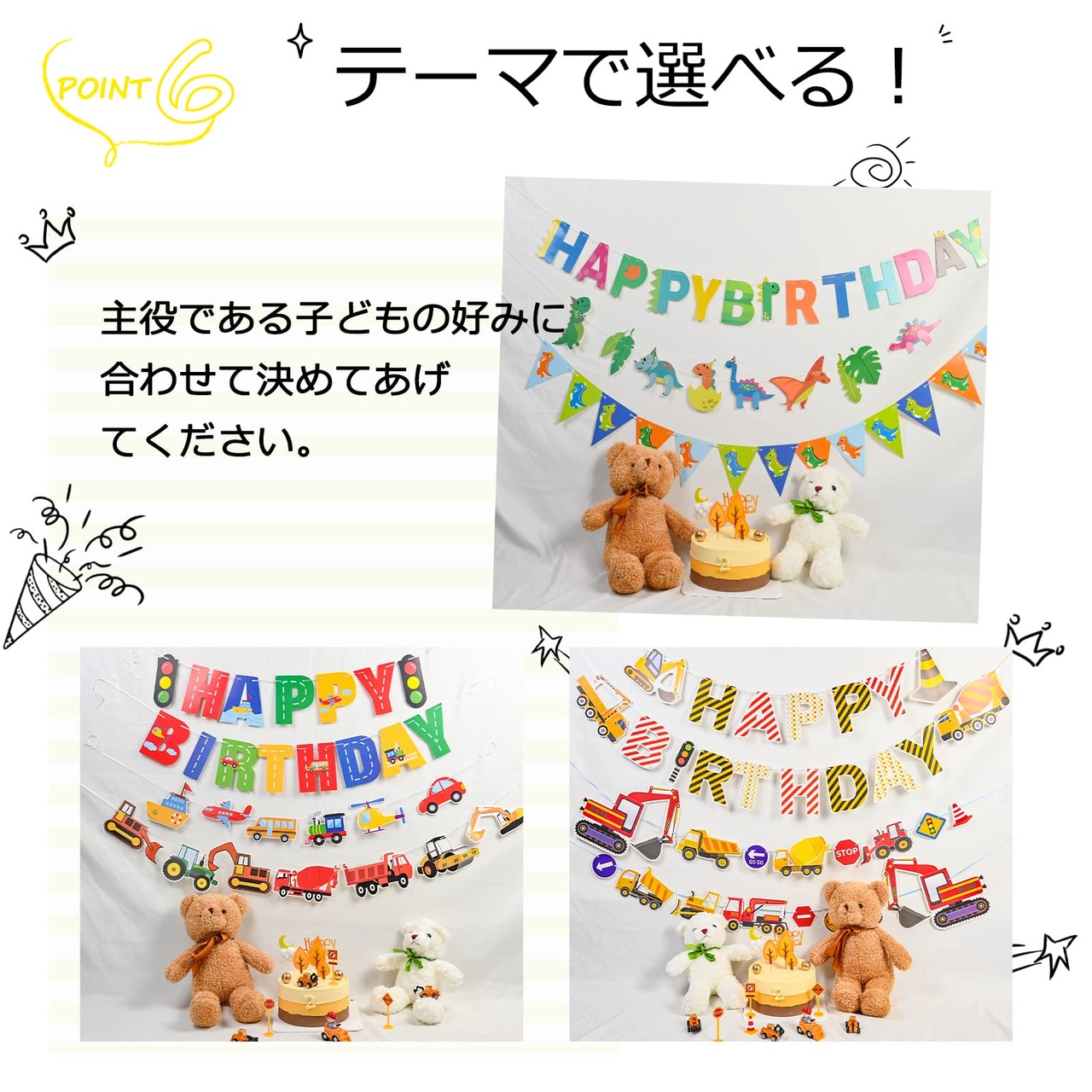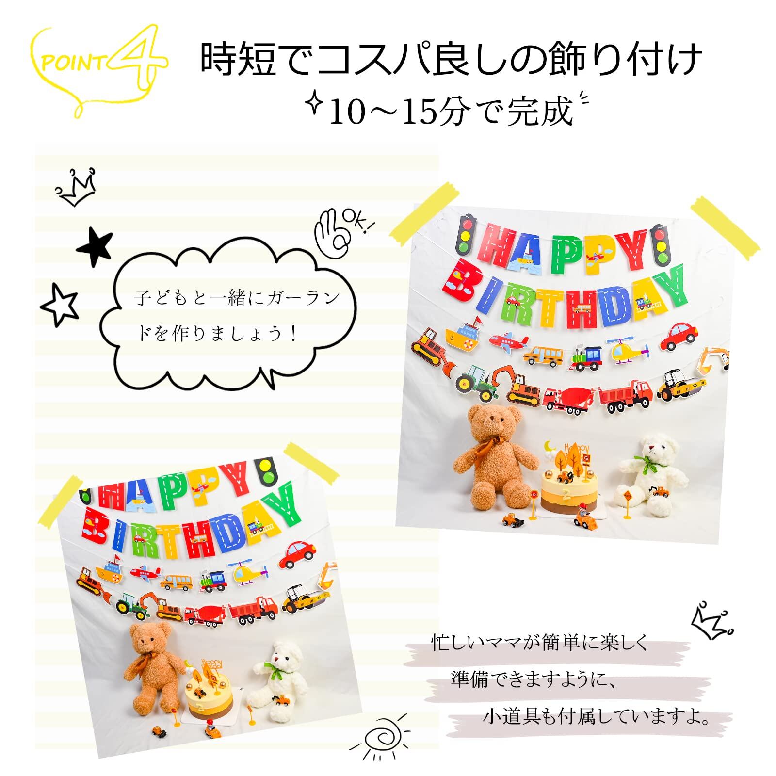 セット内容:HAPPY BIRTHDAYガーランド×1、乗り物ガーランド×1、工事車両ガーランド×1、マスキングテープ×1。糸が細く絡ありやすいので、取り出す際ご注意ください。ガーランドごとに入荷時間が異なるため、色や図案などが異なる可能性がございます。ご了承の上ご注文ください。(対象年齢6+以上)