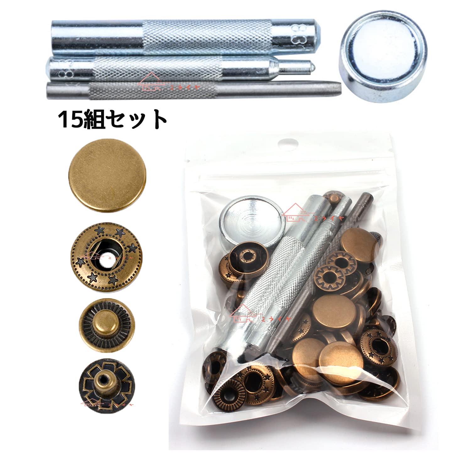 ミライヤ レザークラフト バネ ホック打ち具セット 15mm 15組セット スナップ ボタン 穴あけポンチ 打ち具 打ち台 ハトメ抜き 手芸 ハンドメイド 革DIY (合計15組+4点打ち具)