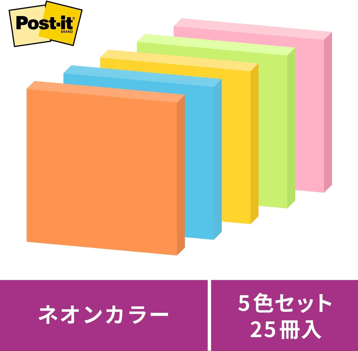 3M ポストイット 付箋 強粘着 大きい ネオンカラー 75×75mm 90枚×5パッド 654-5SSAN