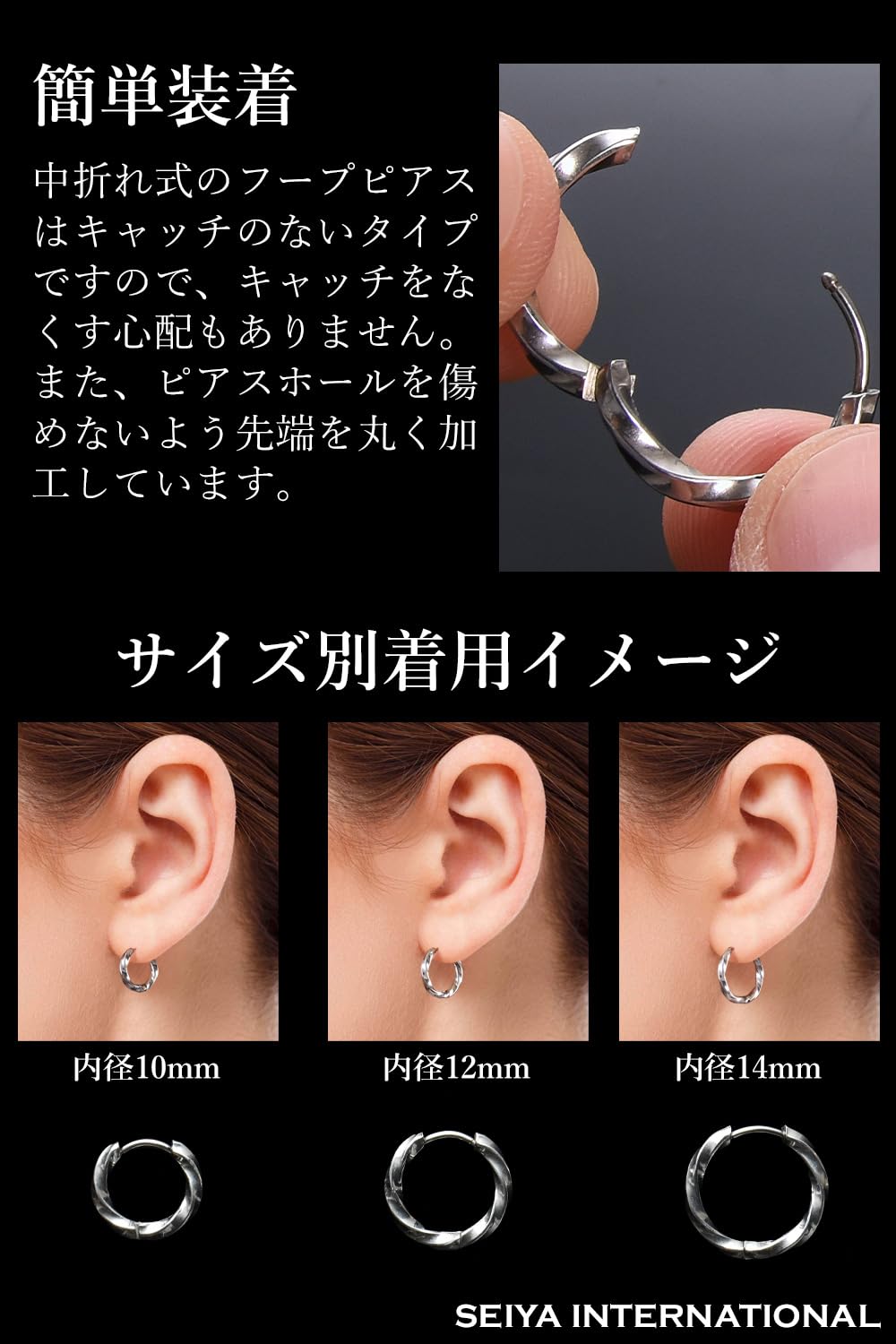 【キャッチ不要でワンタッチ取付 】 中折れ式のフープピアスはキャッチのないタイプですので、キャッチをなくす心配もありません。ポスト(針)が外に出ないので引っかかりがなく、付け外しが簡単です。