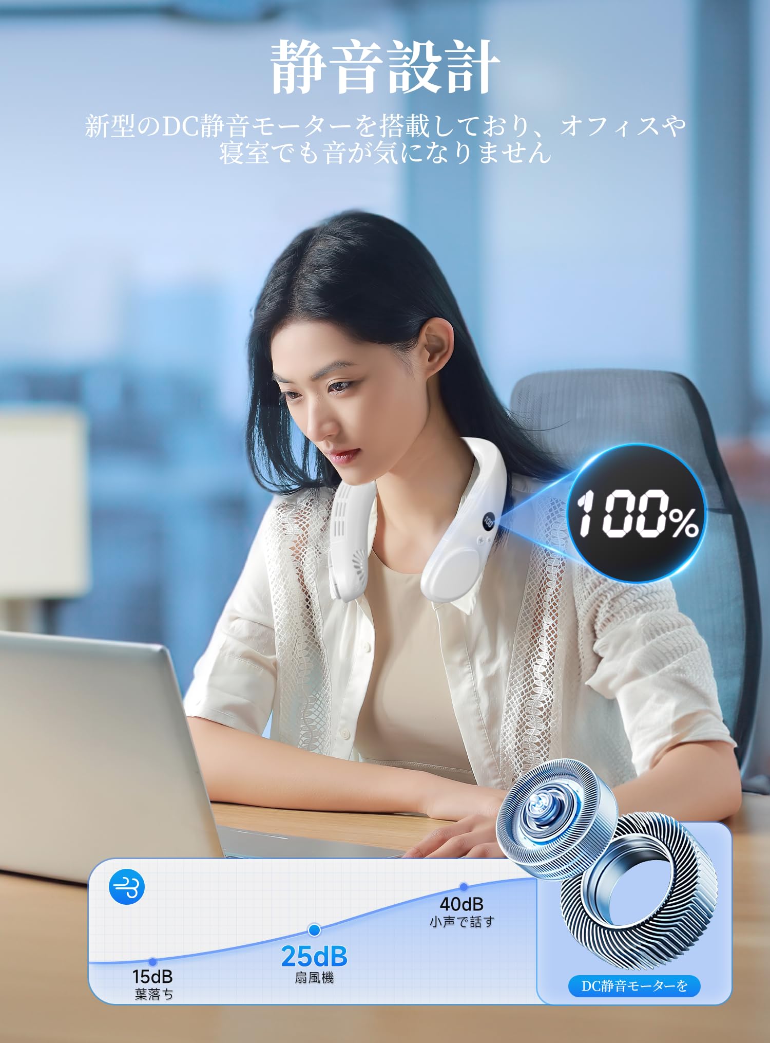 ??【羽根なし設計・静音設計】 最新の羽根なし設計を採用し、髪の毛や衣服が巻き込まれる心配が一切ありません。エアロダイナミック風道設計により、滑らかで均一な風を提供し、快適な涼しさを実現。さらに、最新のDC静音モーターを搭載し、動作音はわずか20dB以下。図書館のような静かな環境でも周囲に気兼ねなくご利用いただけます。カフェやオフィス、自宅でのリラックスタイムにも最適です