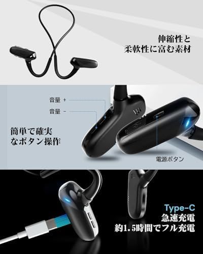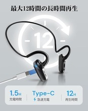 長時間連続使用・type-C充電対応:空気伝導式Bluetooth イヤホンは高品質なバッテリーが内蔵されており、一度の充電で8時間から12時間もの連続使用が可能です。(※再生可能時間は、音量、再生内容、使用環境によって異なります)。主流のType-Cポートを採用し、効率良く充電できます。これにより、日常生活や仕事、さらには長時間の移動中でも安心して使用することができます。