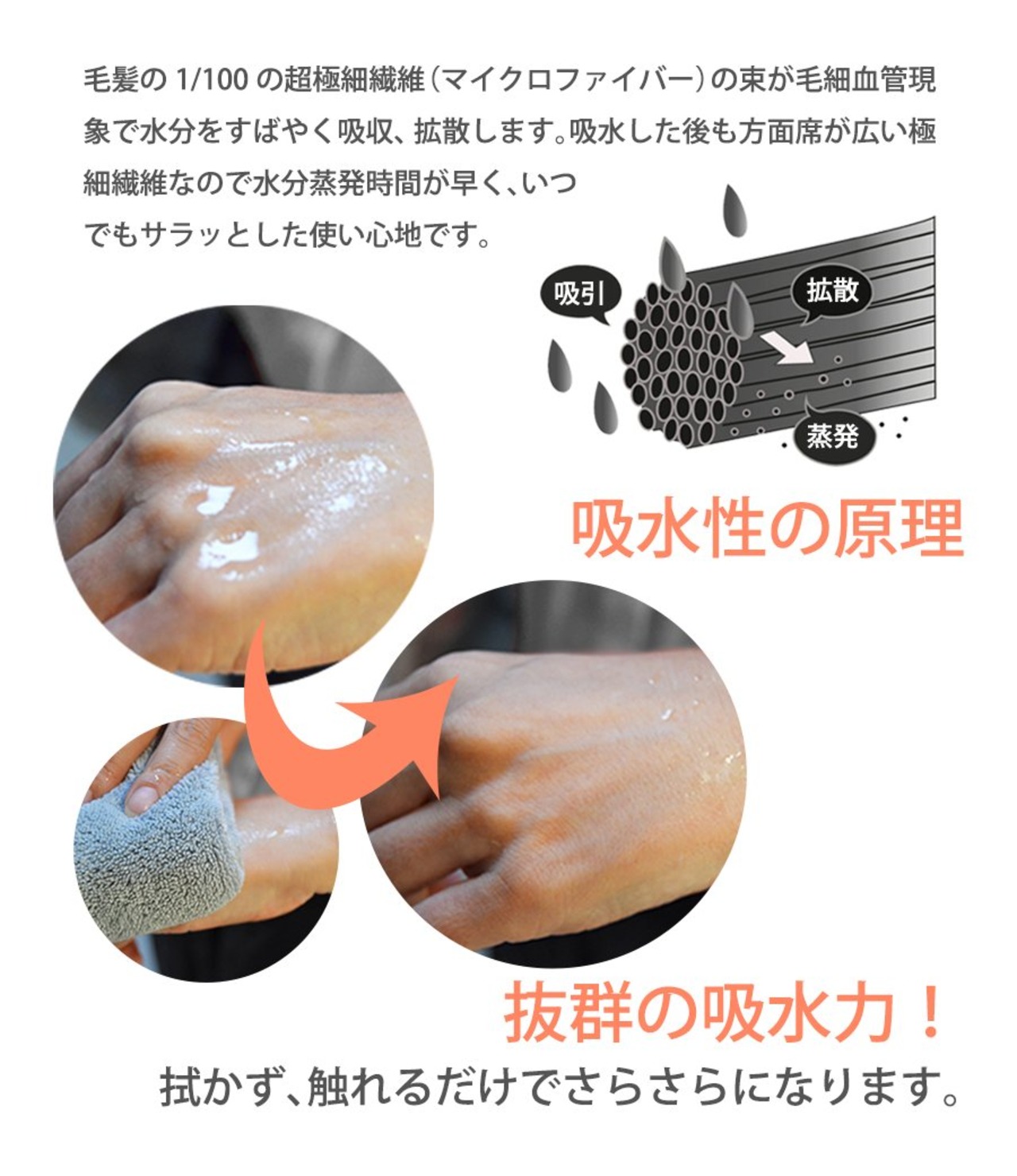 【拭かず、触れるだけでさらさらになる】毛髪の1/100の超極細繊維(マイクロファイバー)の束が毛細血管現象で水分をすばやく吸収、拡散します。拭かず、触れるだけでさらさらになります。