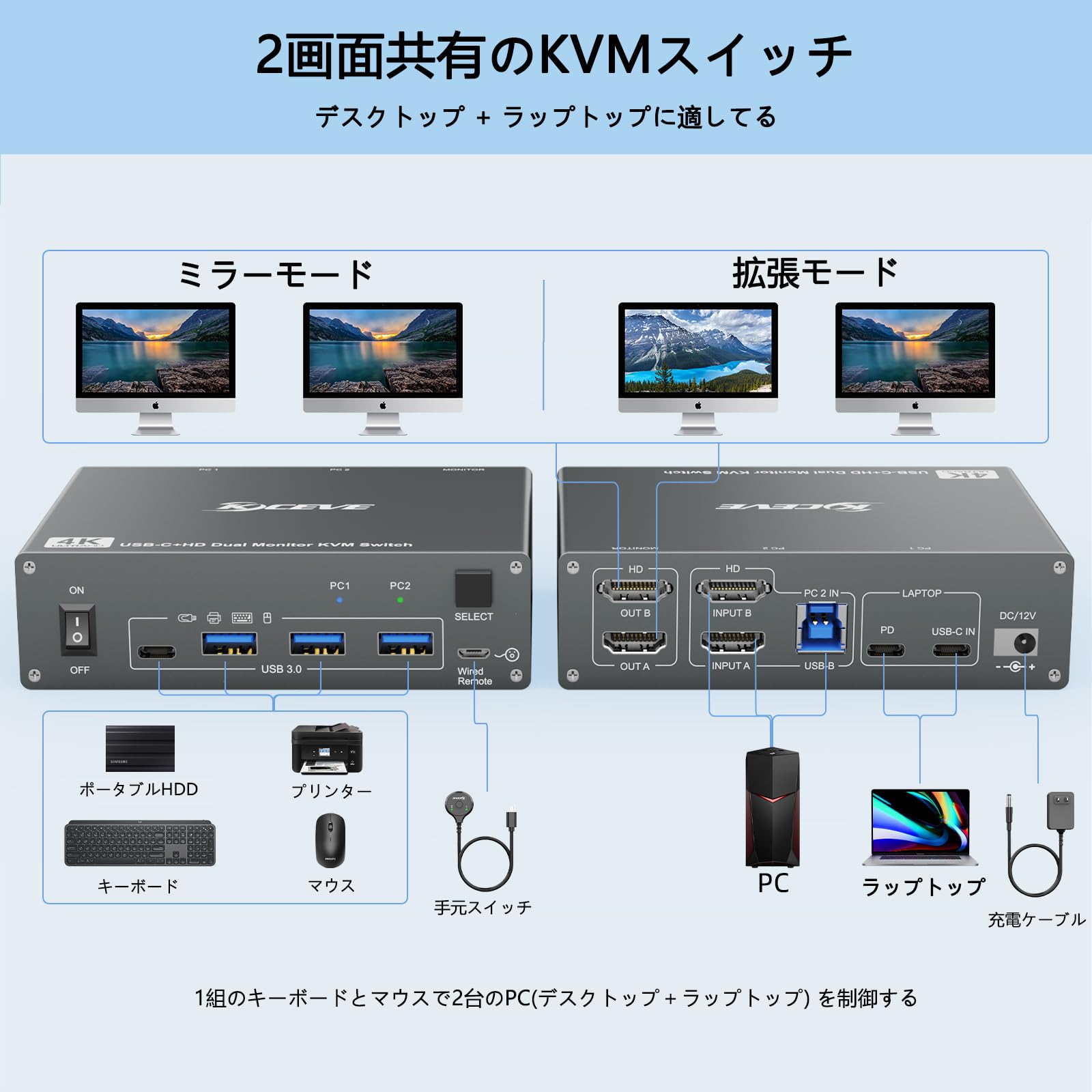 KCEVE デスクトップ+ラップトップ、2入力2出力 デュアルモニター USB-C HDMI Type-C KVMスイッチ 4K@60Hz USB3.0 KVM 切替器、100W PD(ラップトップ用)、2台のモニターと1組のキーボード マウスを共有できる