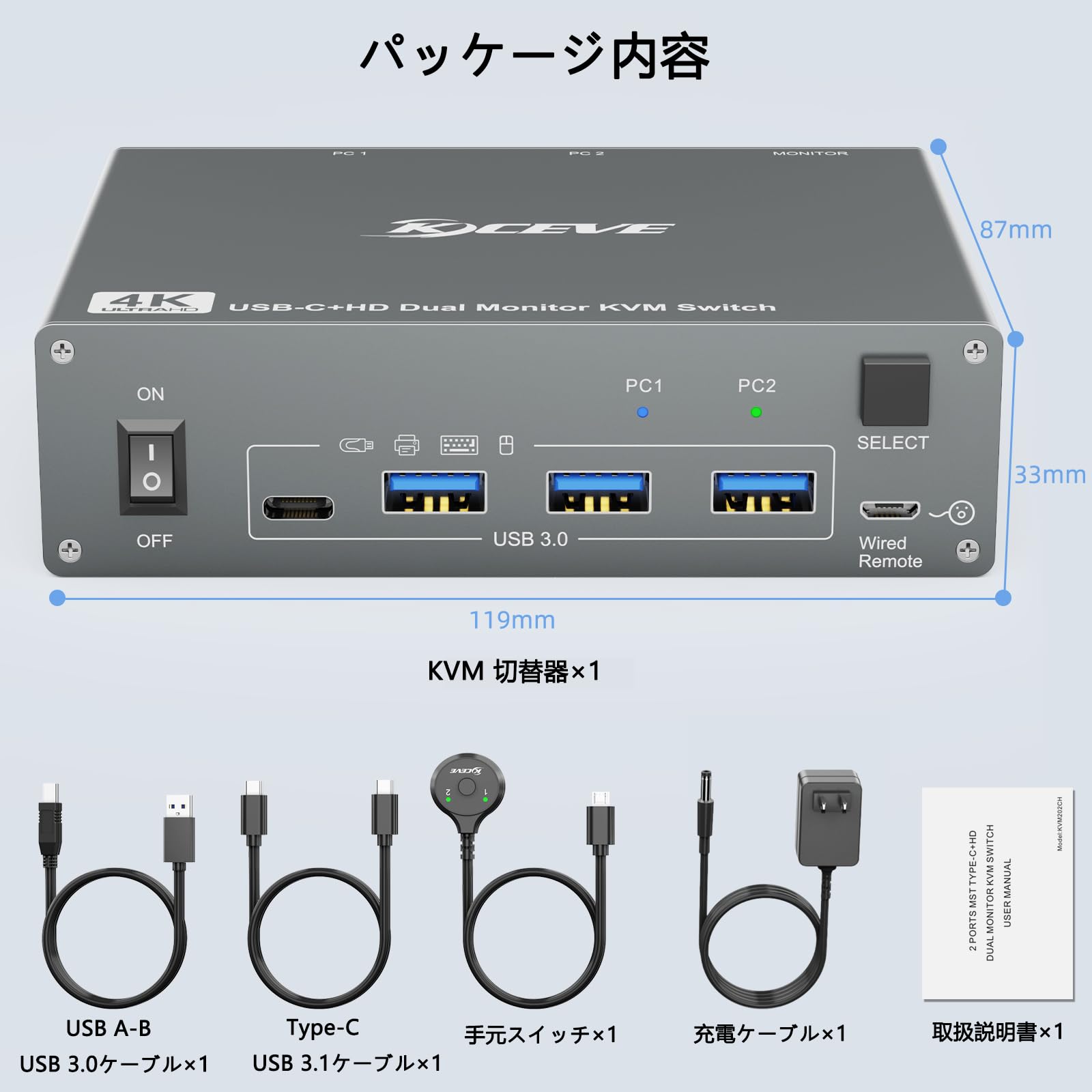 【在庫処分】KCEVE デスクトップ+ラップトップ、2入力2出力 デュアルモニター USB-C HDMI Type-C KVMスイッチ 4K@60Hz USB3.0 KVM 切替器、100W PD(ラップトップ用)、2台のモニターと1組のキーボード マウスを共有できる | GIGATERA