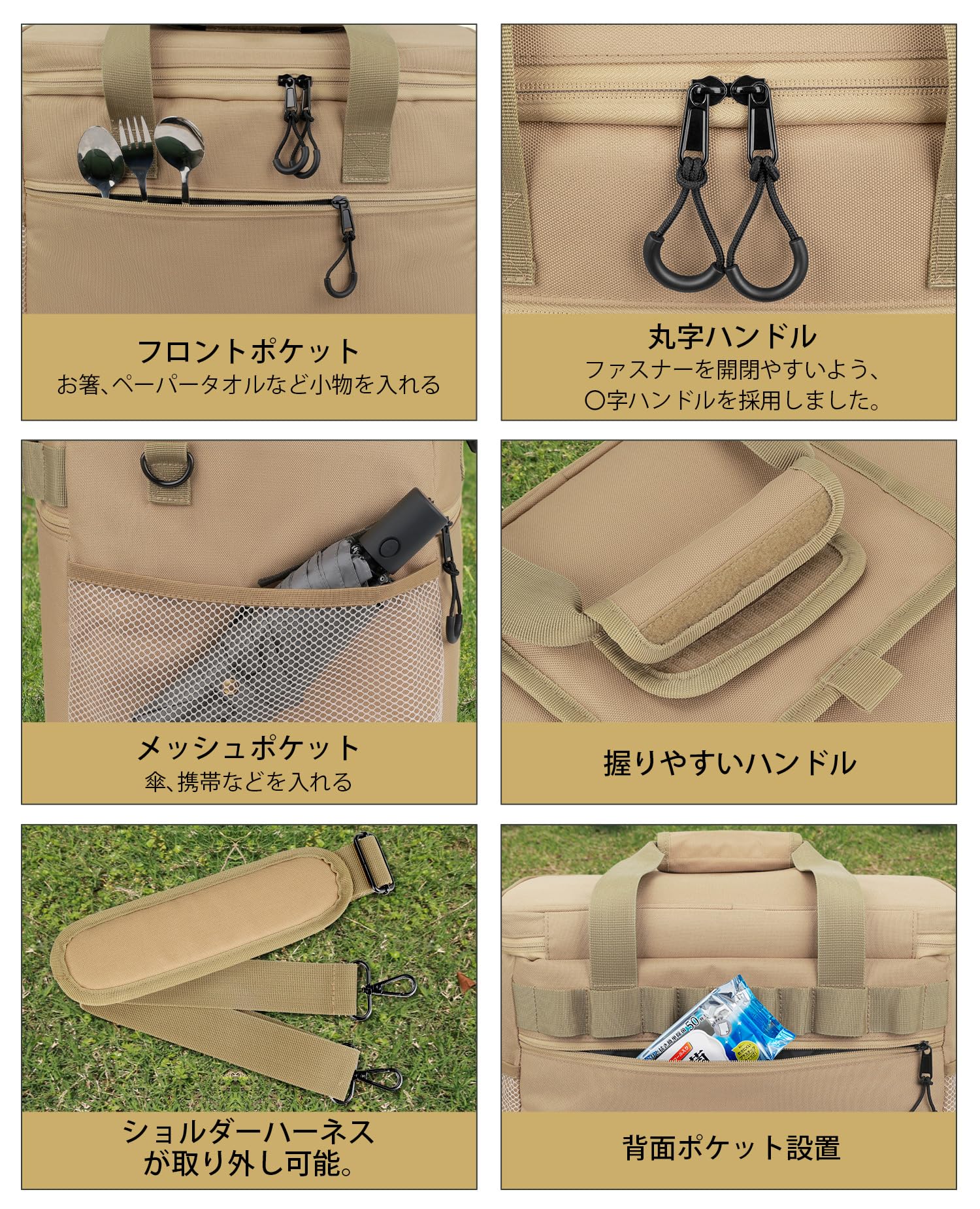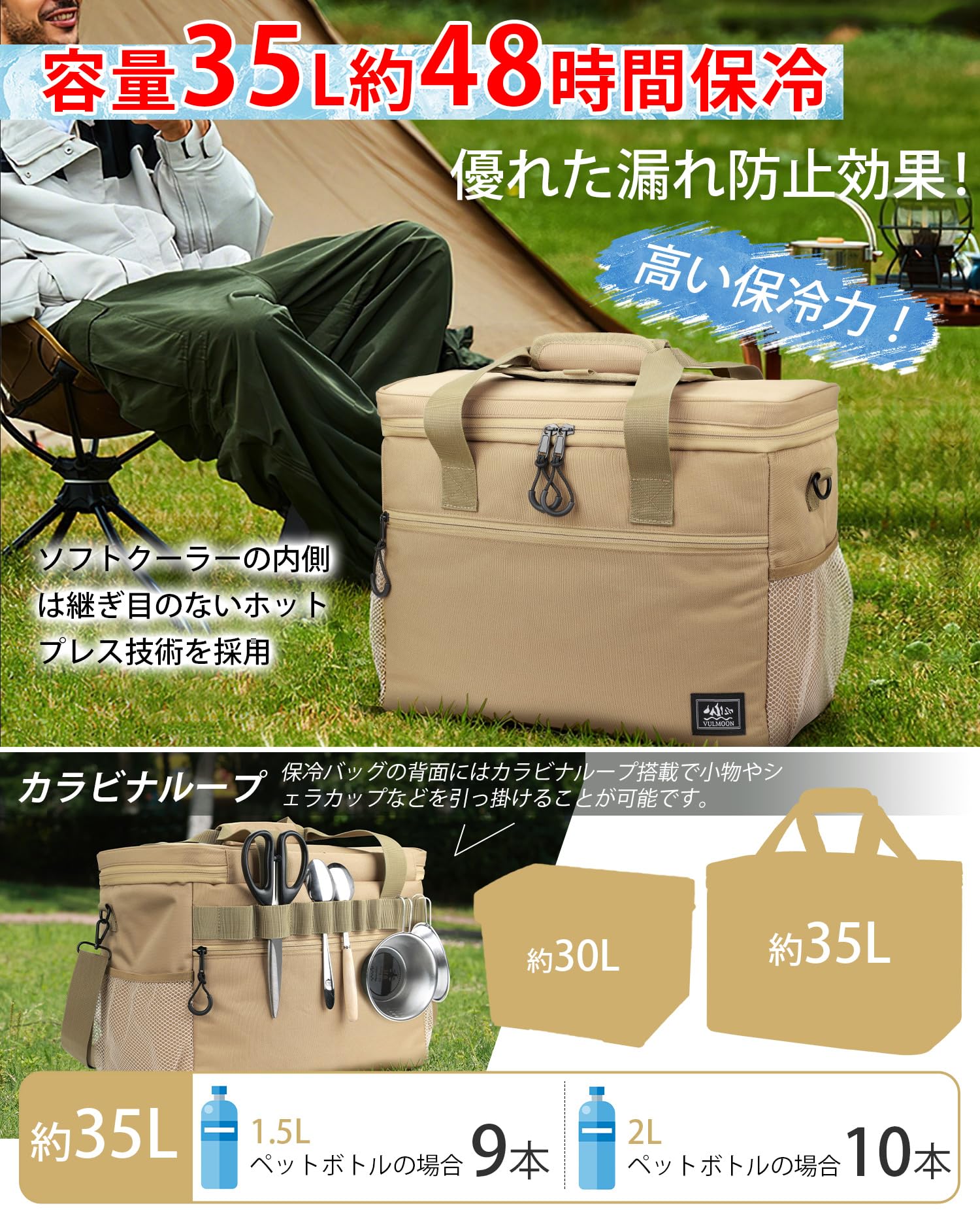 ?? 【35L大容量優れた漏れ防止効果!】ソフトクーラーの内側は継ぎ目のないホットプレス技術を採用、雨具、食器、その他必需品を収納するのに十分なスペースもあります。背面ポケット、カラビナループも搭載で小物やシエラカップなど引っ掛けていただけくことが可能① 握りやすいハンドル ② メッシュポケット 傘、携帯などを入れる ③ ステンレス製バックル採用、頑丈で耐久性が高める。④ 壊れやすい部分しっかり補強、丁寧なステッチで縫製します。⑤ 丸字ハンドル、ファスナーを開閉やすいよう、〇字ハンドルを採用しました。⑥ ショルダーハーネスが取り外し可能手持ちと肩掛け、水平ハンドヘルドの3通りの方法で利用できます。