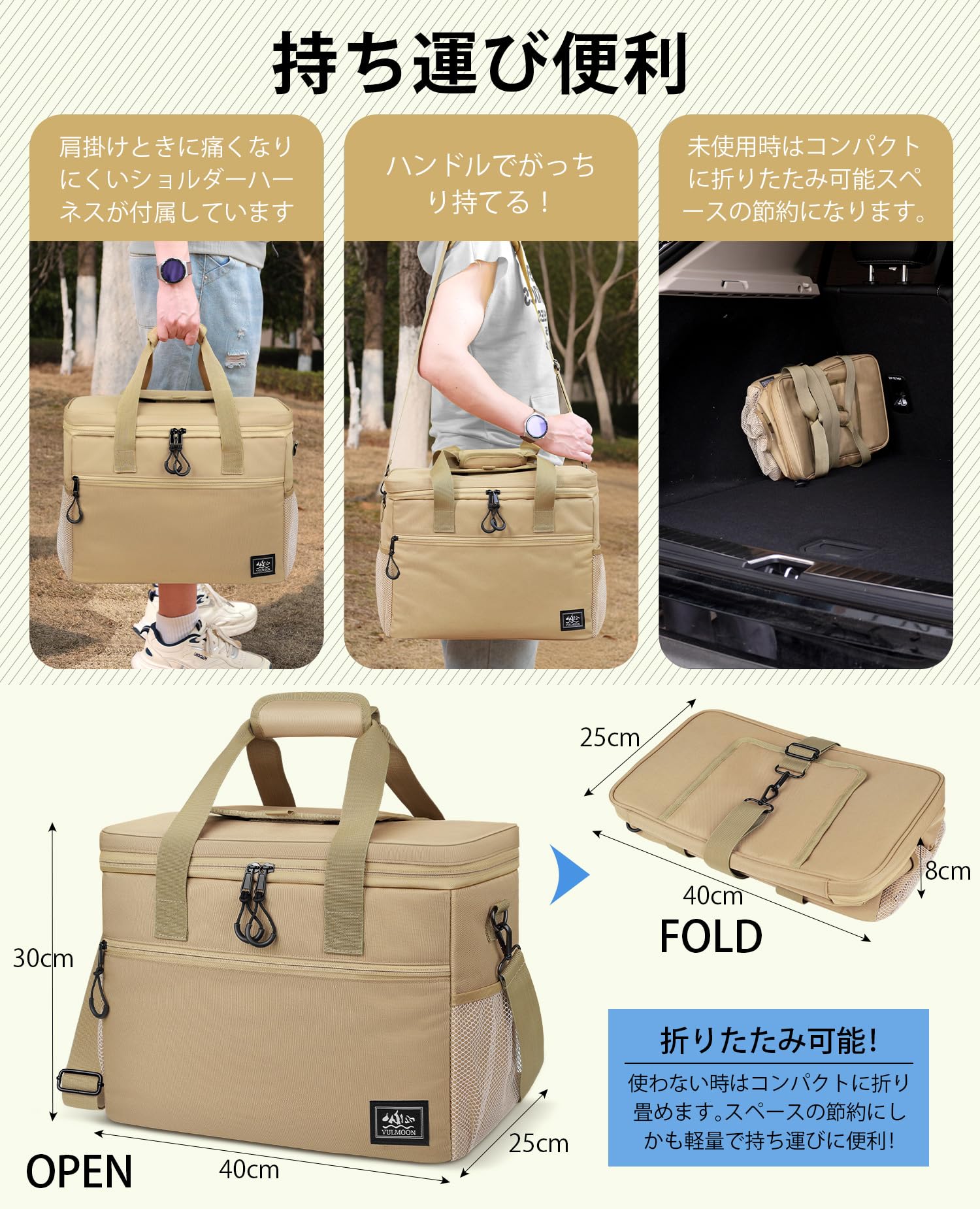 ?? 製品サイズ(約): 横40cm×高さ30cm×幅25cm 本体容量(約): 35L(350ml缶×25本縦置 500ml缶×25本縦置 重量(約): 0.8kg 材質: 本体:表地=高密度オックスフォードクロス、裏地=PEVA、断熱材=ポリエチレンフォーム(5mm厚)、中敷=ポリエチレン(1.0mm厚)