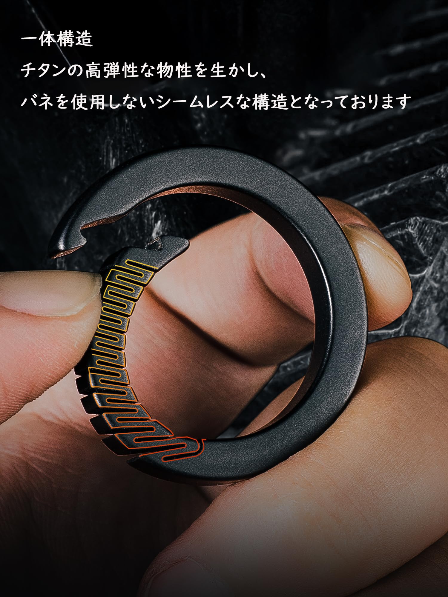 [簡単に使える]高強度のため加工しにくいチタンを、高い技術で美しく加工した工業製品の造形美が楽しめます。バネを使用せず、チタンのしなやかで高弾な特性を活かしたシームレスな開口部です。開閉は片手でも簡単にできる丸いキーホルダーです。