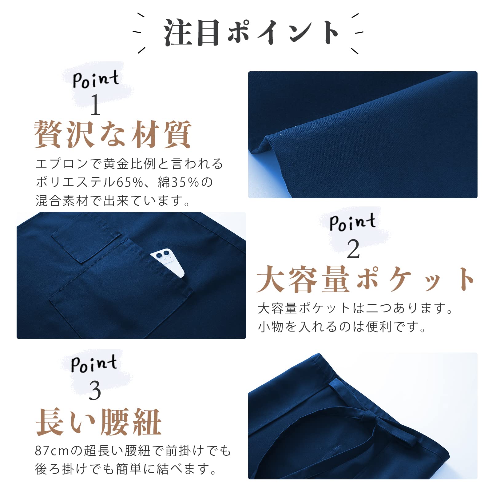 【シンプルなデザイン】シンプルなデザインで、ナイロン製のエプロンに比べて丈夫で縮みにくく、シワになりにくいです。腰紐もしっかりしているため、繰り返し使用しても心配いりません。