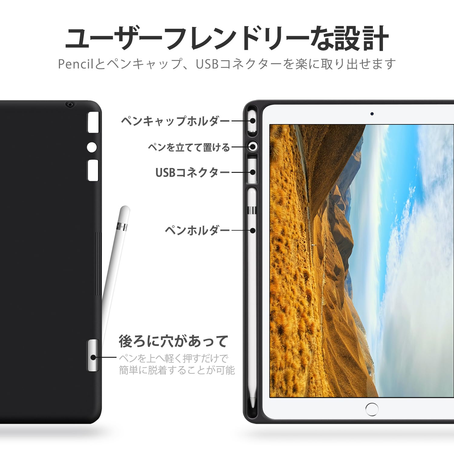 3、【ペンホルダー内蔵】ペン/ペンキャップ/ライトニングアダプタスロットが内蔵されており、これを使えば、ペンをしっかりと保管し紛失を避けることができます。スロットの後ろには3つの開口部があり、ペンやスペアパーツを楽に取り外すことができます。