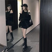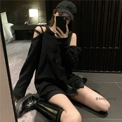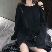 【特価在庫】[ShuMing] トレーナー レディース 長袖パーカー オフショルダー ゆったり カットソー 無地 シンプル 黒 トップス ストリート系 韓国風 おしゃれ 地雷系 プルオーバー | GIGATERA