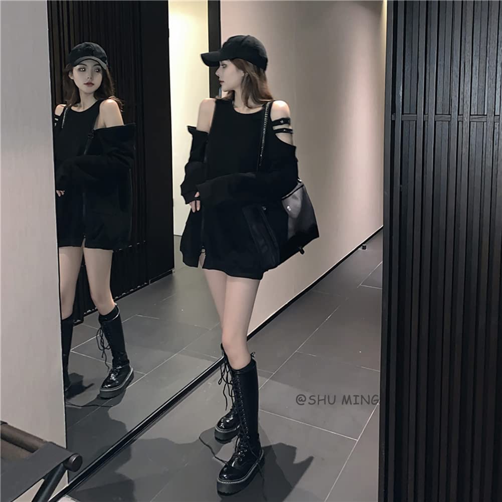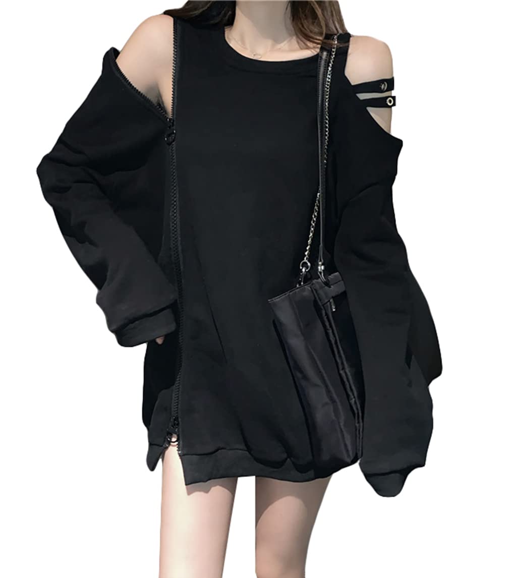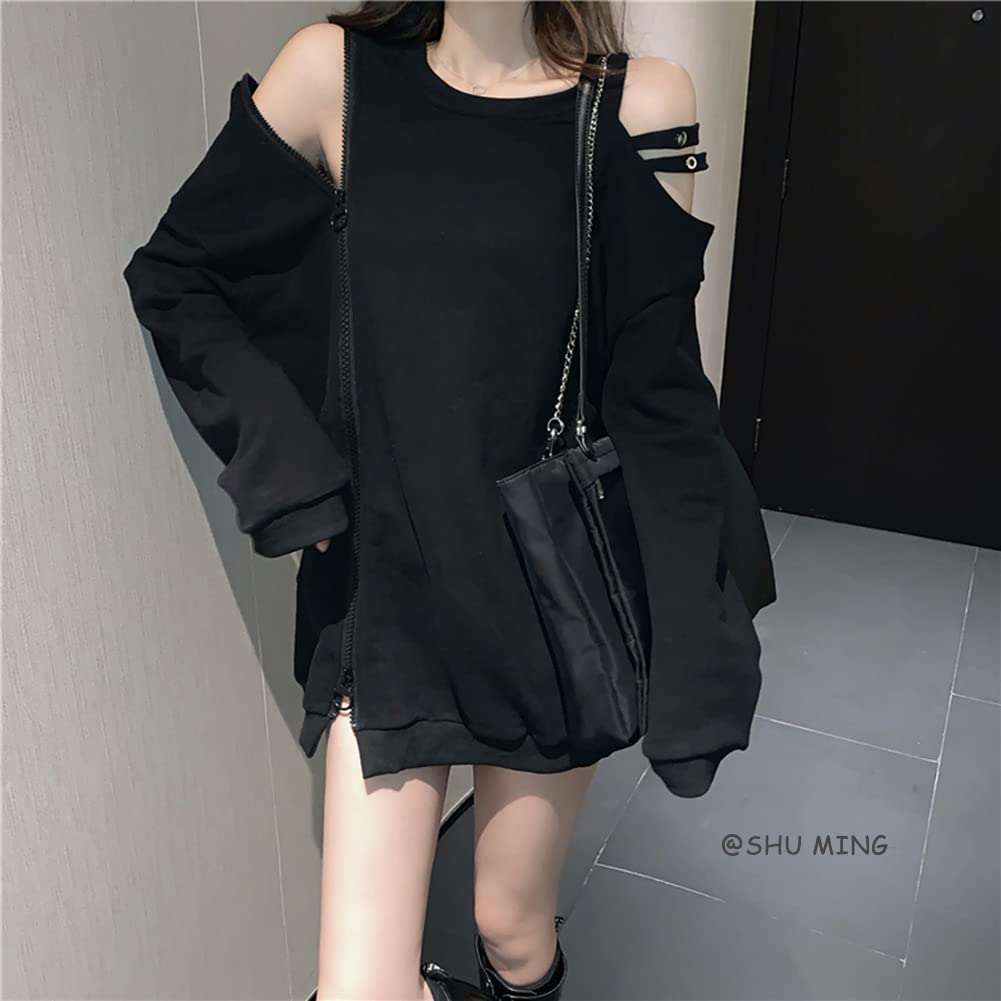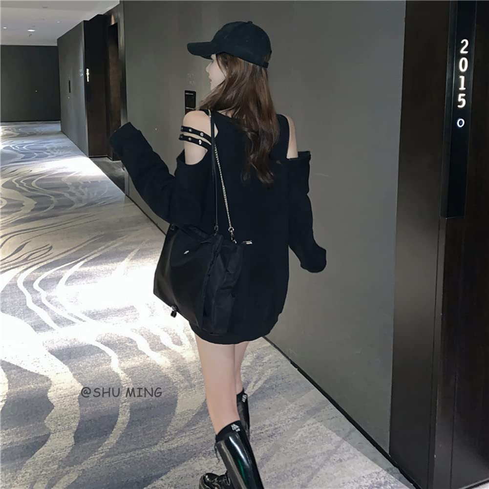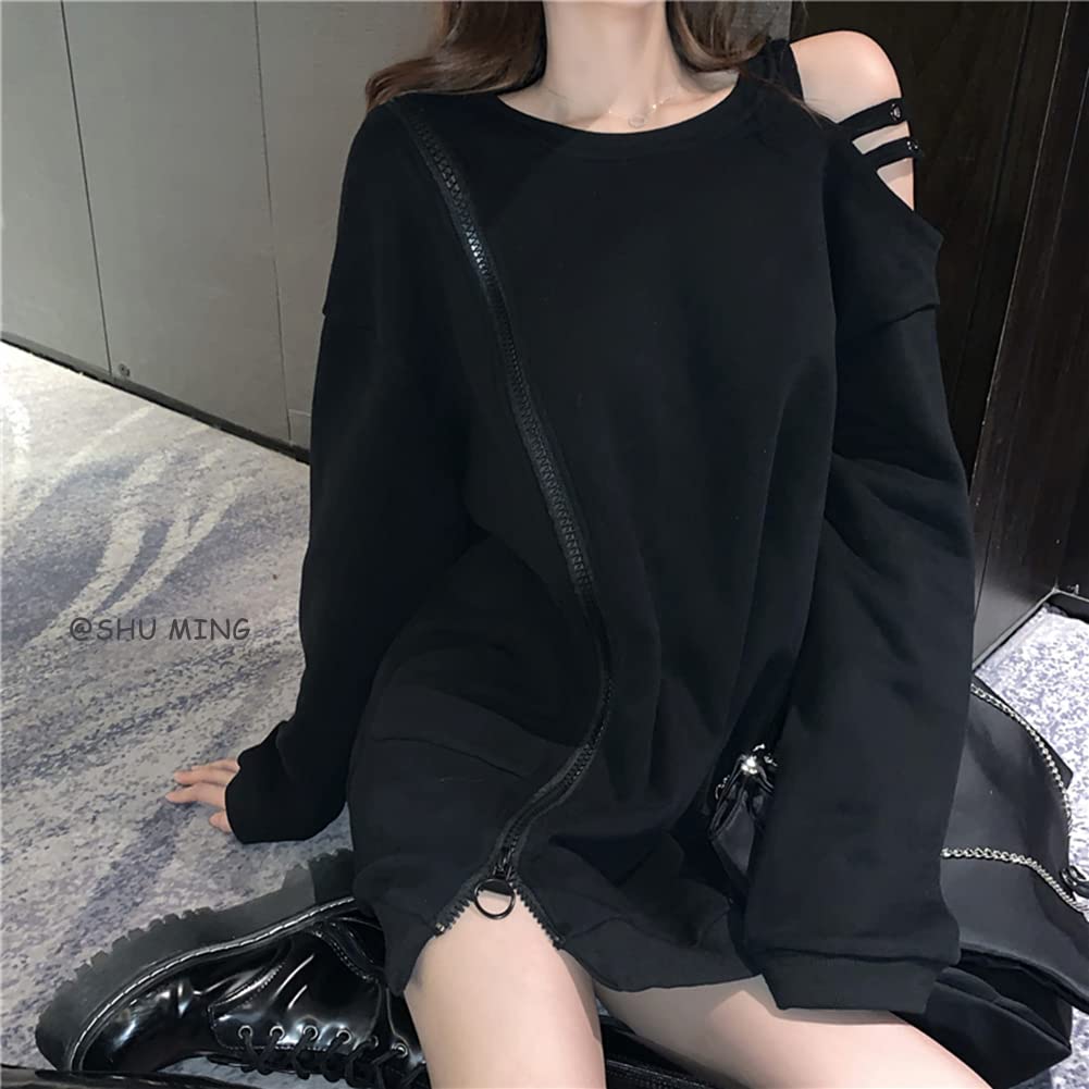 [ShuMing] トレーナー レディース 長袖パーカー オフショルダー ゆったり カットソー 無地 シンプル 黒 トップス ストリート系 韓国風 おしゃれ 地雷系 プルオーバー