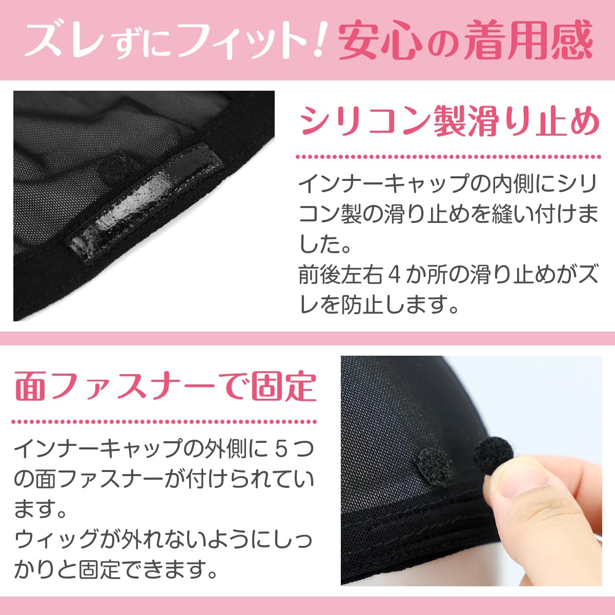 【ズレにくさを追求】インナーキャップの内側には前後左右にシリコン製の滑り止めが付けられています。ピタと密着してくれますので外れる心配がありません。外側には5か所のマジックテープがついている為、ウィッグをしっかりキャッチし、ウィッグがずれるのを防いでくれます。蓋は必要に応じて付け外し可能。