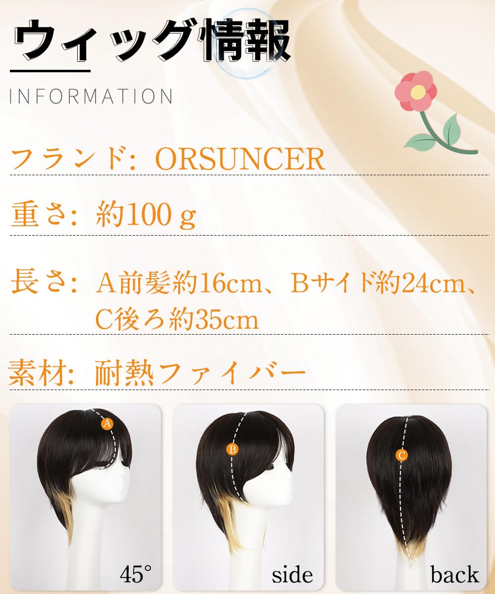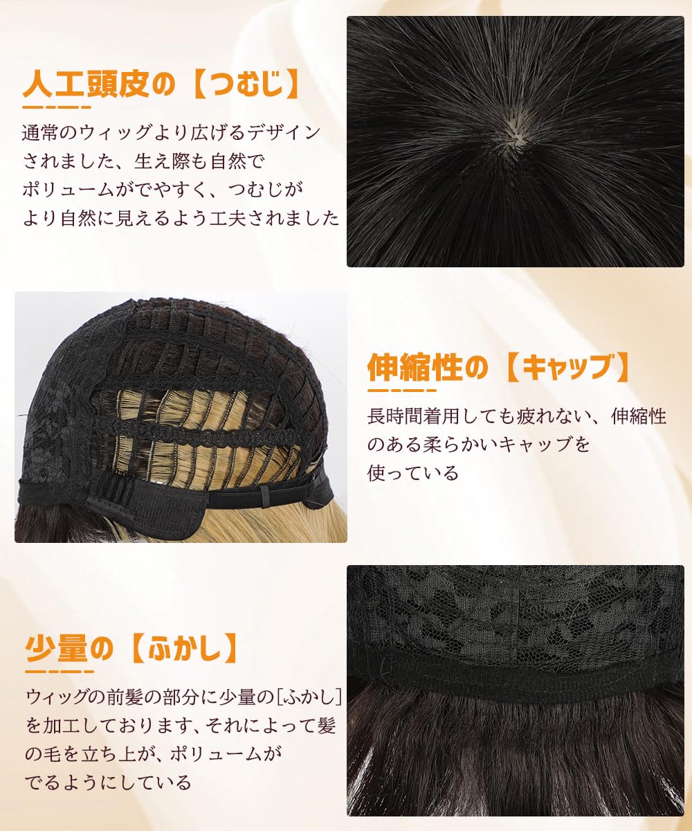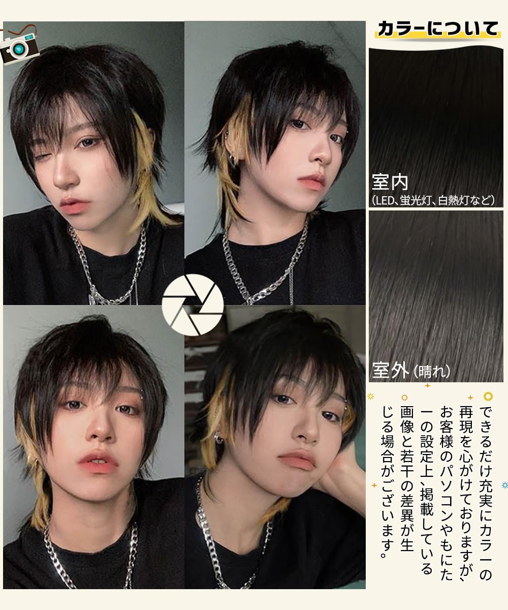 【商品情報】①カラー:黒&ゴールド。ほどんどの肌色に適合します。 ②タイプ:カジュアルウルフカットショートカツラ。 ③素材:耐熱ファイバー。160 ℃までコテ、アイロン使用OK。 ④裏側:バラメッシュネット。 良好な通気性と弾力のあるバンドを使用、着用し最適! ⑤アジャスター付き:フック式で、頭周りにあわせて段階調節可能(頭周り:約56~58 cm)。