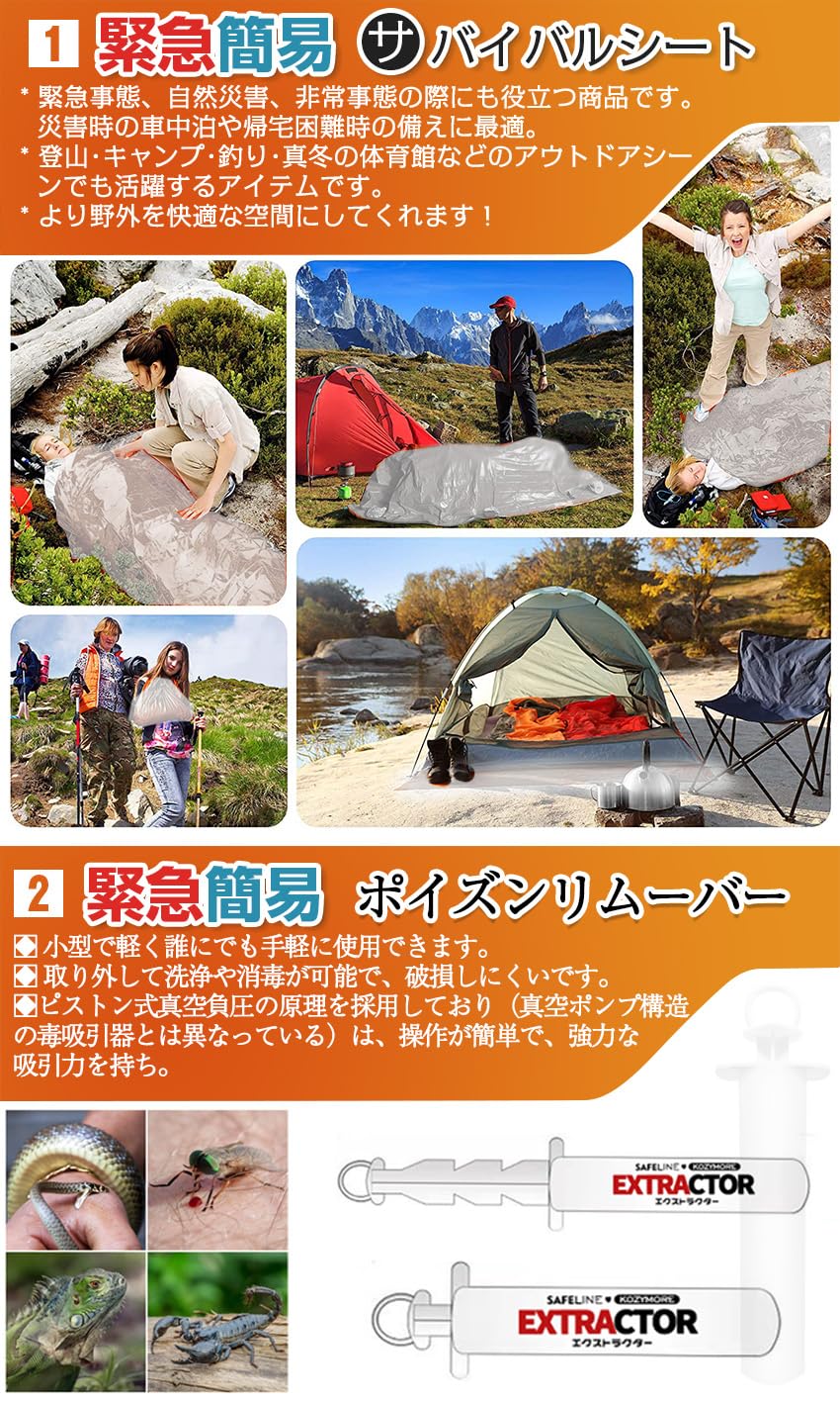 【実用的な救急用品】私たちはユーザーの目線に立ち、緊急時に必要な救急用品をすでに備えて付けています。内容物:サバイバルシート、緊急簡易トイレ、ポイズンリムーバー、ホイッスル、はさみ等21種類。もちろん、使用用途や目的に合わせて中身をユーザーご自身で調整することも可能です。