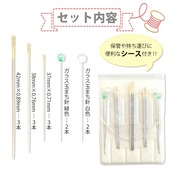 薄地〜厚地の生地に対応した3サイズの縫い針、2色のガラスがかわいいガラスまち針のアソートセットです。
