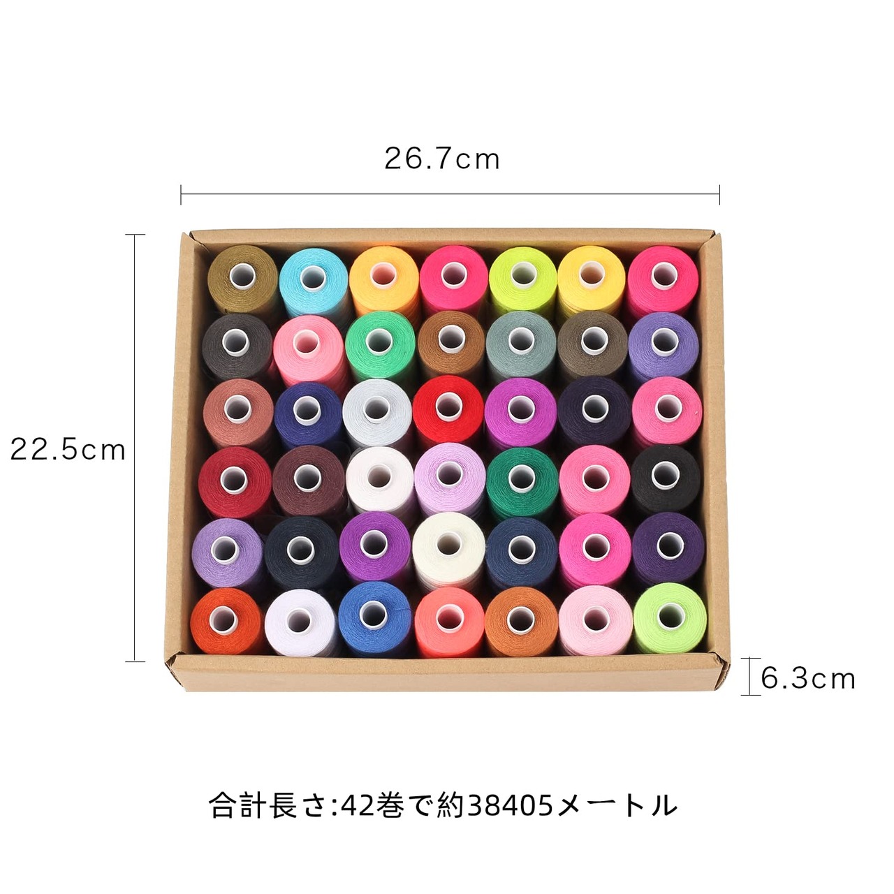 糸の太さ:60番。糸の長さ:1000ヤード(約914.4m)/巻,合計42巻-38404.8m。素材:ポリエステル。梱包サイズ:26.7X22.5X6.3cm