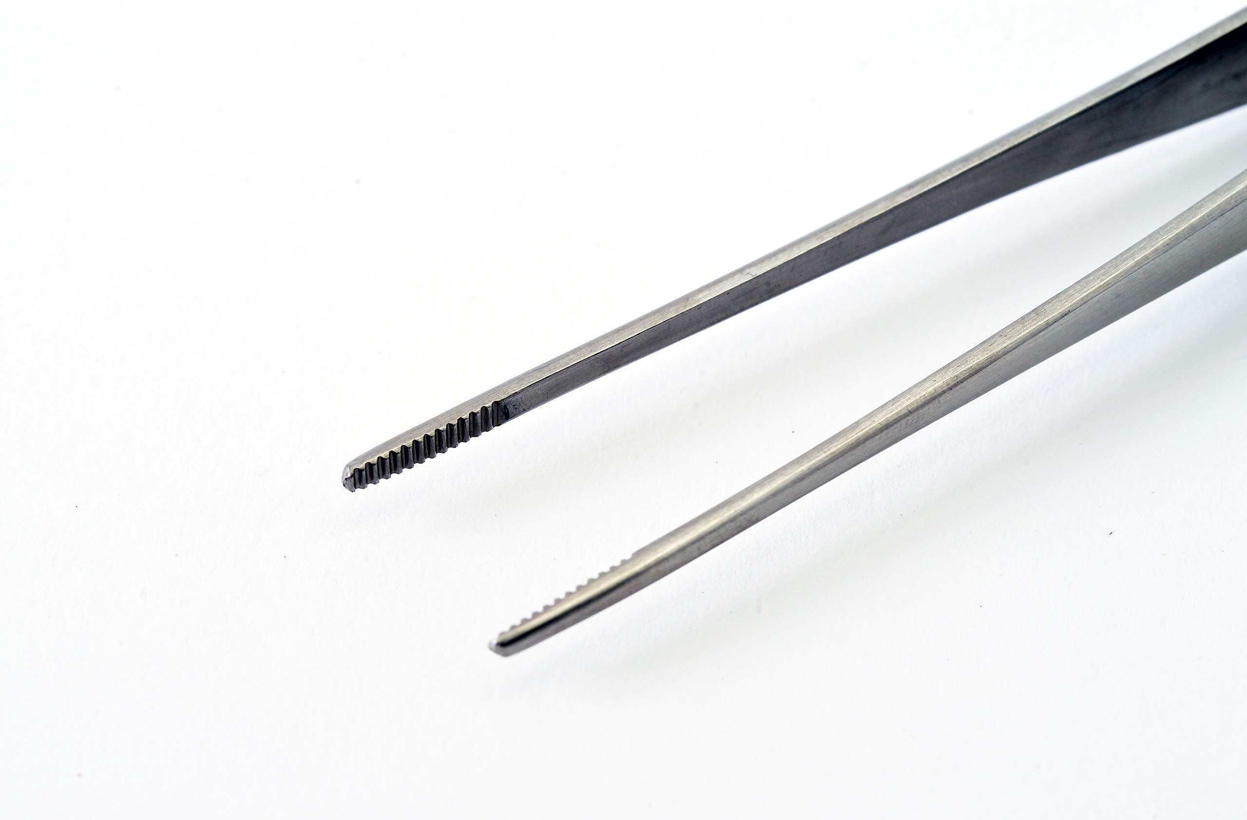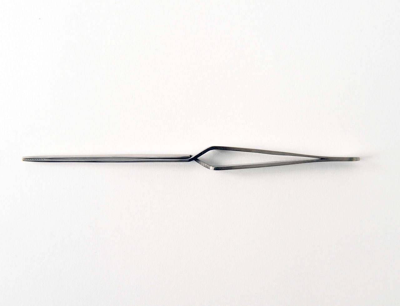 ローレット付きの逆作用ピンセット。本体を握ると先端が開き、離すと閉じます。