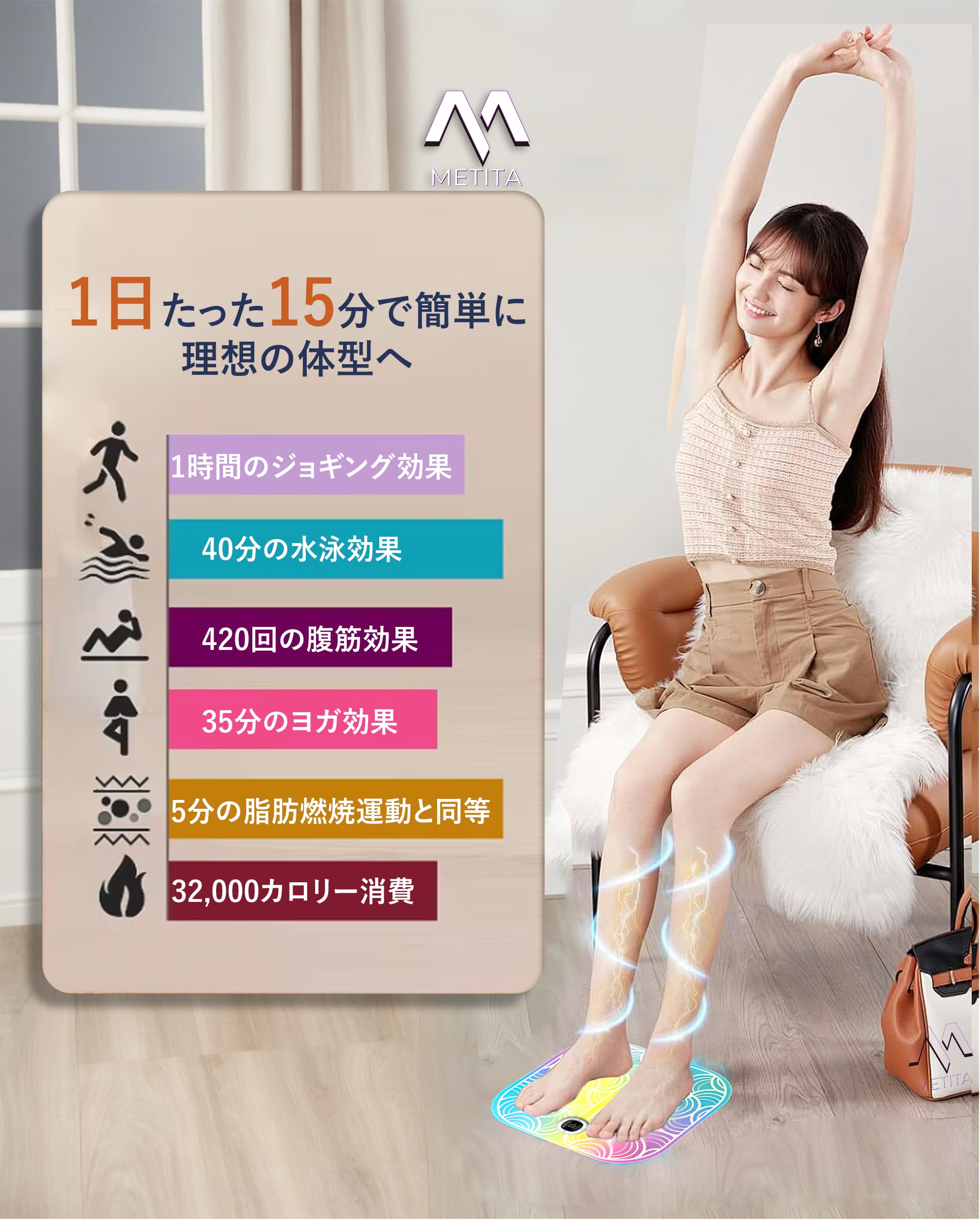 【足用EMS「おうちで簡単フットリラクゼーション」】 外を歩くのが大変ですか?自宅で手軽に足をリラックスさせたいですか?この足用EMSマットは、特に女性やご年配の方々にぴったり。立ち仕事が多い方々にも、リラックスしたひとときを提供します?? TPU+ABS製のこのEMSマットは、使い方が簡単で、マットに足をのせてスイッチを入れるだけ。EMSの刺激で普段あまり使わない筋肉をリラックスさせ、心地よい感覚を提供します。