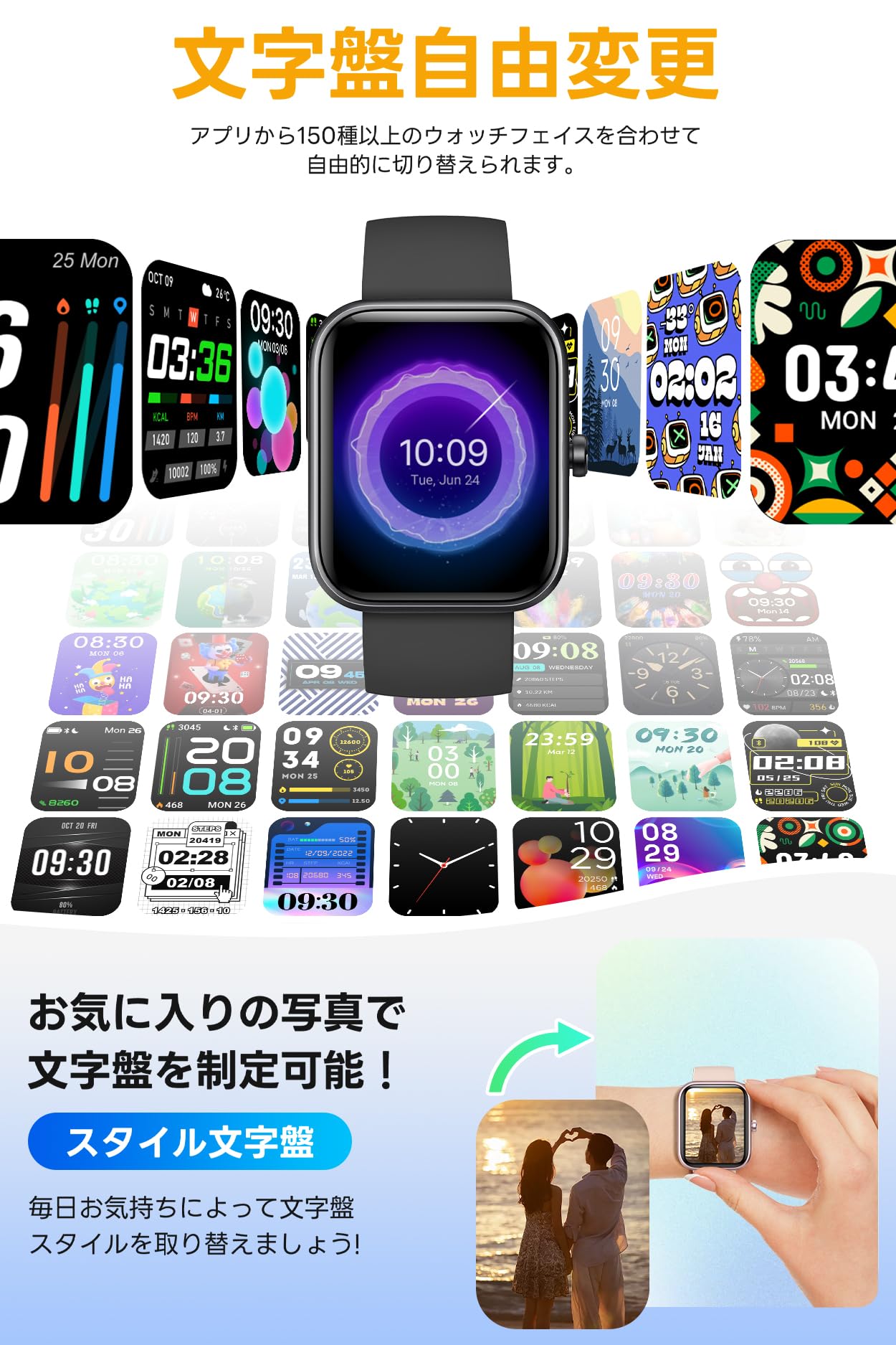 ?【1.83インチ大画面&DIY文字盤】スマートウォッチは1.83インチの高精細ディスプレイを採用し、明るく見やすい画面で、通知や文字が一目で確認できます。スマートフォンのような滑らかなタッチ操作で使いやすさも抜群です。また、150種類以上のスタイリッシュな文字盤デザインに加え、スマートフォンからお気に入りの写真(ペット、家族、風景など)を取り込んでオリジナル文字盤を作ることができます。日替わりで気分に合わせて画面をカスタマイズし、毎日に彩りをプラス。