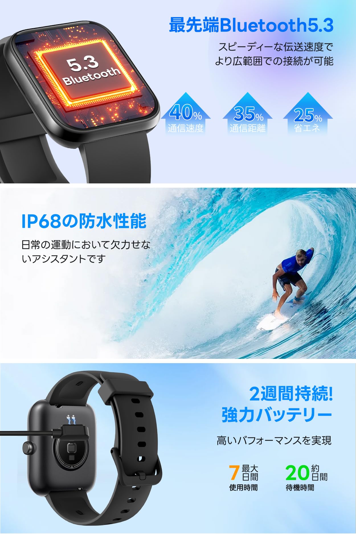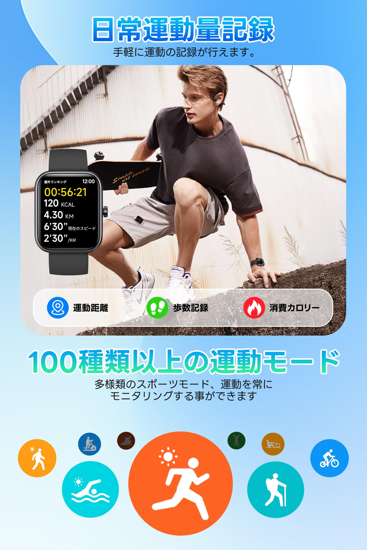?【長時間バッテリー&100種以上のスポーツモードに対応&IP68防水】大容量バッテリーを搭載しており、約2.5時間のフル充電で最大5〜7日間使用可能。スマートウォッチには100種類以上の運動モードを搭載しており、ウォーキング、ランニング、ヨガ、フィットネス、バスケットボール、水泳など多様なアクティビティをしっかり記録します。歩数、運動距離、消費カロリーも正確にモニタリングされるため、日々の健康管理やダイエットにも役立ちます。さらに、IP68等級の防水仕様により、手洗いや洗顔、雨の日の使用でも安心。汗をかくトレーニング時にも気にせず使えます。(※お風呂・サウナ・温泉での使用はご遠慮ください)