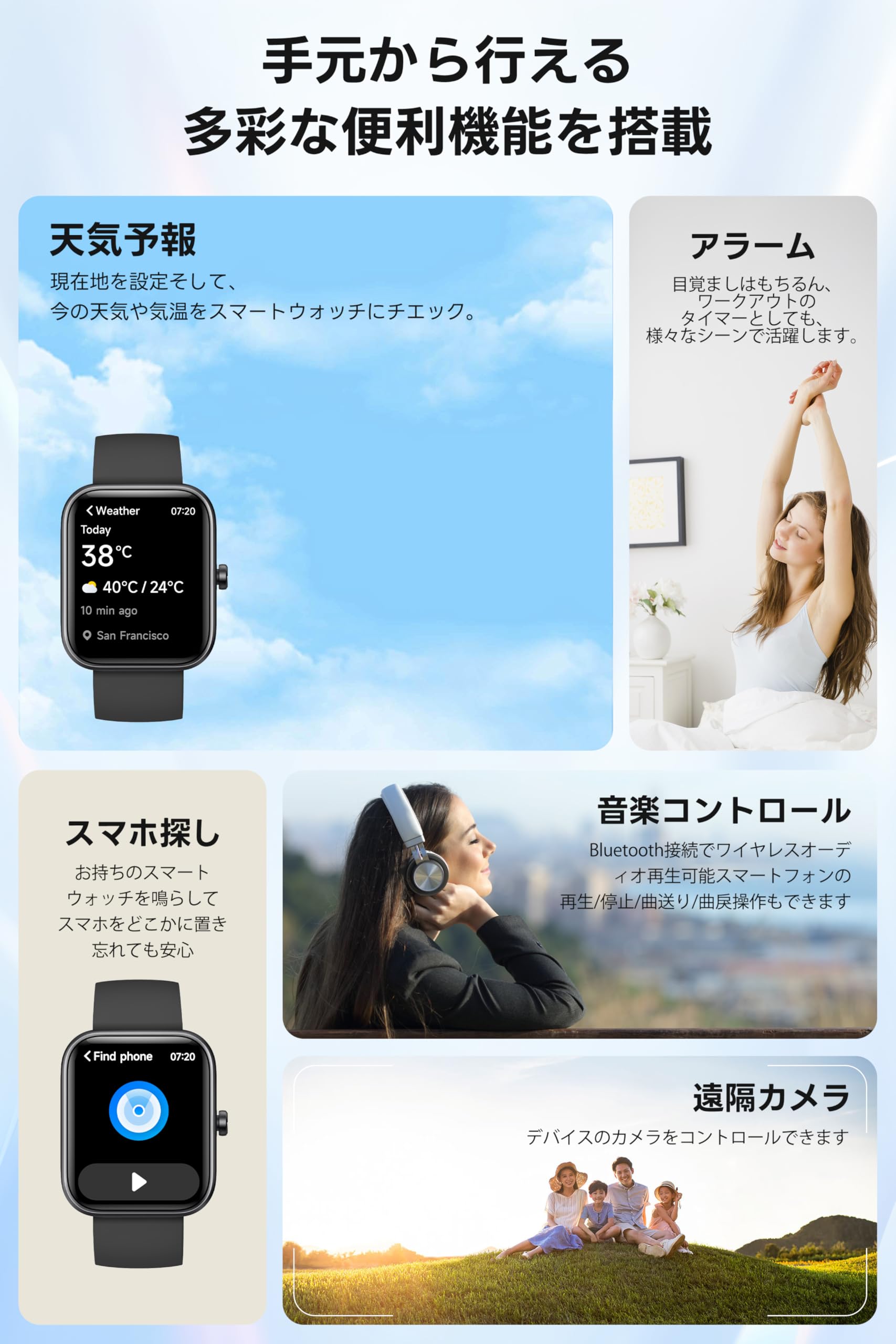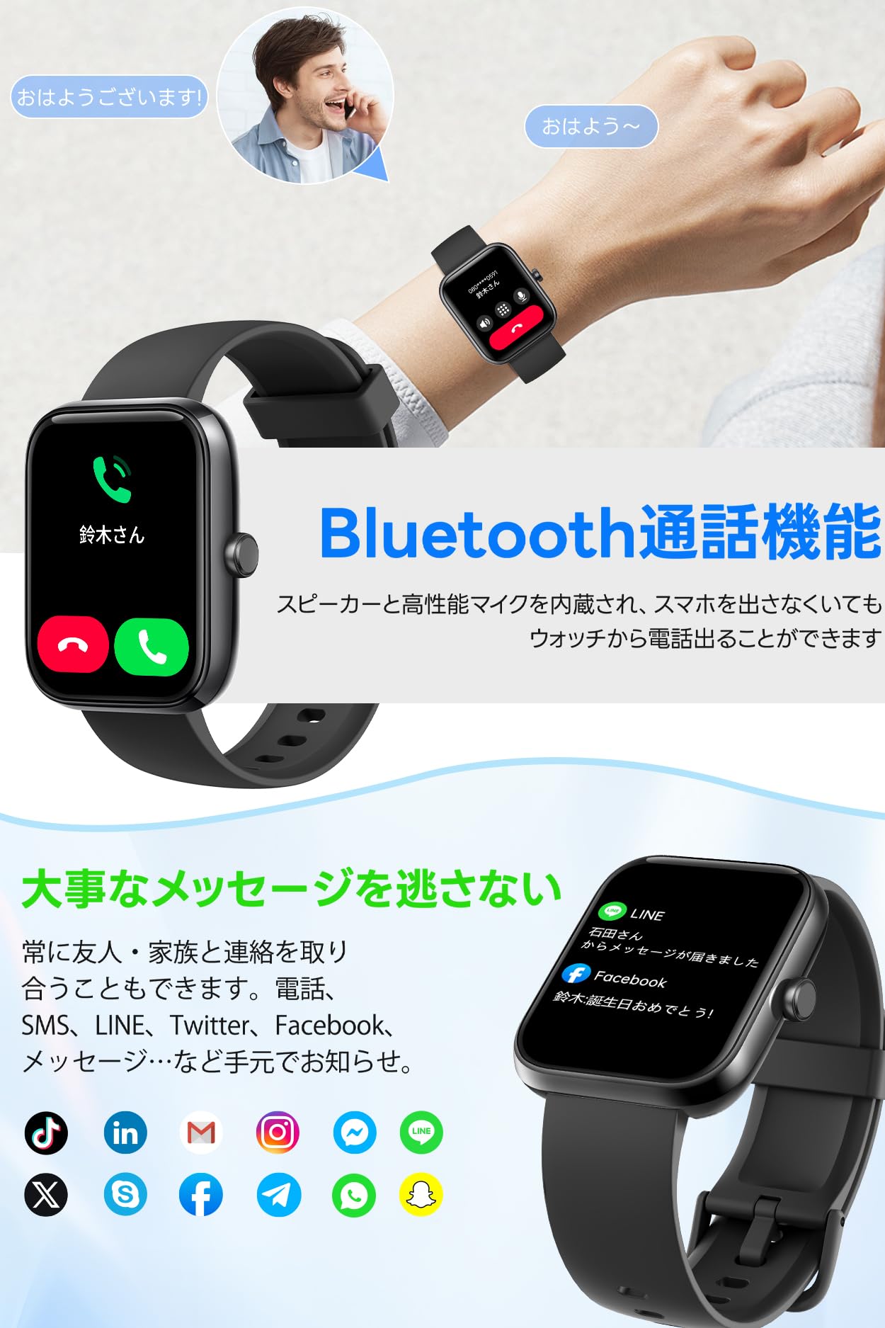 ?【Bluetooth 5.3通話&メッセージ通知をもっと快適に】スマートウォッチは高性能マイクとスピーカーを内蔵しており、Bluetooth 5.3を介してスマートフォンと接続することで、通話の受信・発信・履歴確認・連絡先の保存がすべてウォッチ上で可能になります。わざわざスマホを取り出す必要がなく、運転中や作業中でもスムーズに通話できます。また、LINE、Facebook、Instagram、X(旧Twitter)などの通知も即座に受信でき、重要なメッセージを見逃しません。iOSとAndroid両方の端末に対応しており、日常のコミュニケーションをより便利にサポートします。