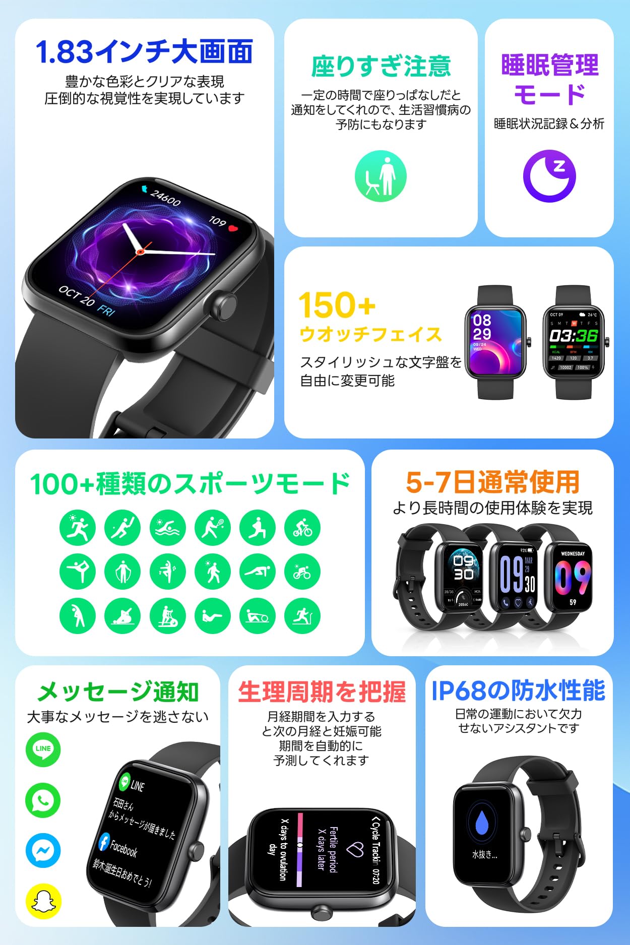 スマートウォッチ【2025新登場・性能進化モデル】iPhone対応 アンドロイド対応 Bluetooth通話機能付き 1.83インチ大画面 SMS/Line通知 Smart Watch 活動量計 腕時計 薄型軽量 バンド交換可能 スポーツウォッチ 120+種類の運動モード 300+種類文字盤 IP68生活防水 メッセージ通知 天気予報 音楽再生 多機能スマートウォッチ レディース メンズ