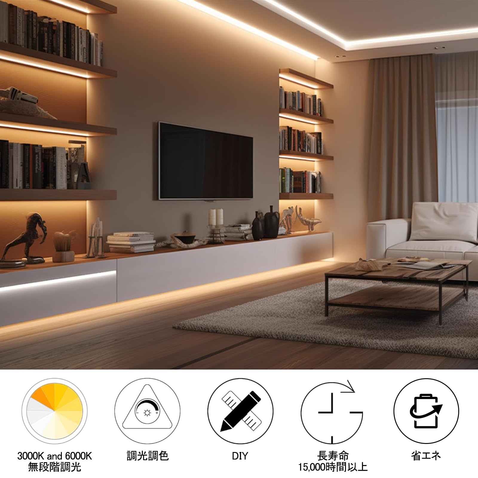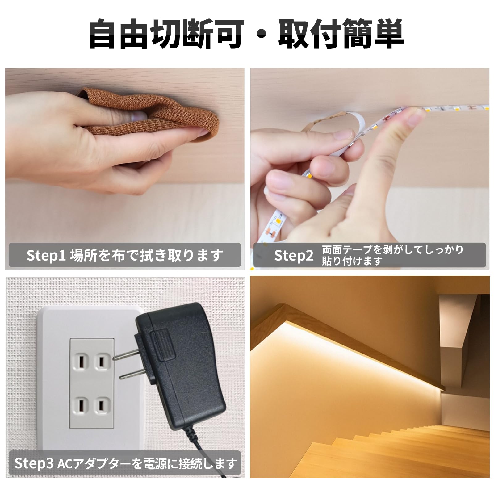 ??【PSE認証済で安全な素材、多様なシーンに対応】ledライトストリップはPES認証に合格しており、安心して使用できます。? 100V〜240Vの電圧に対応し、日本だけでなく海外でも使用できます。 バー、レストラン等の店舗インドア、看板、壁面アイキャッチ、什器照明、作業台照明、ショーケース照明、棚下照明、デスク、タンス、テレビラック、ベッド、ディスプレイなどの多種多様な場所に使用されます。