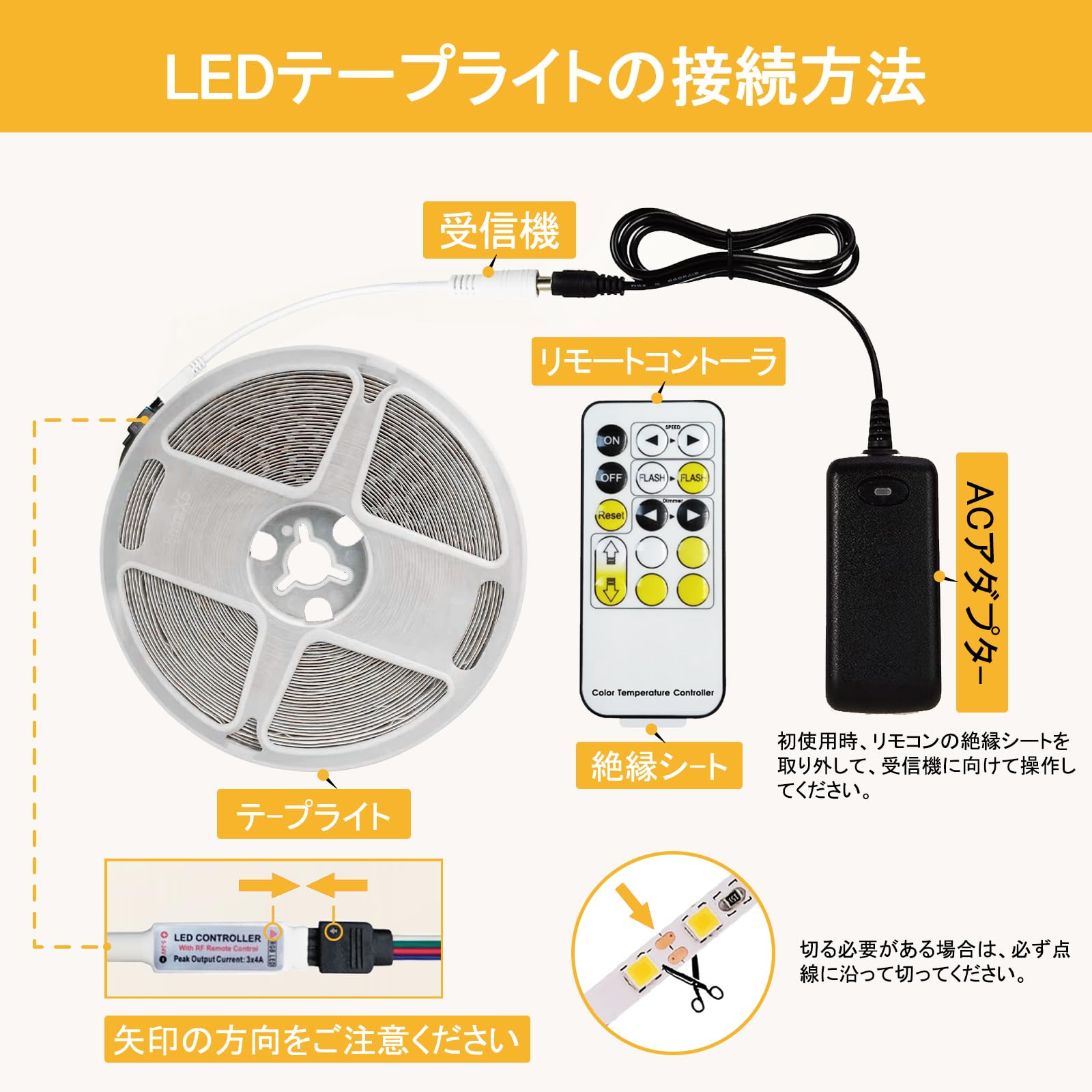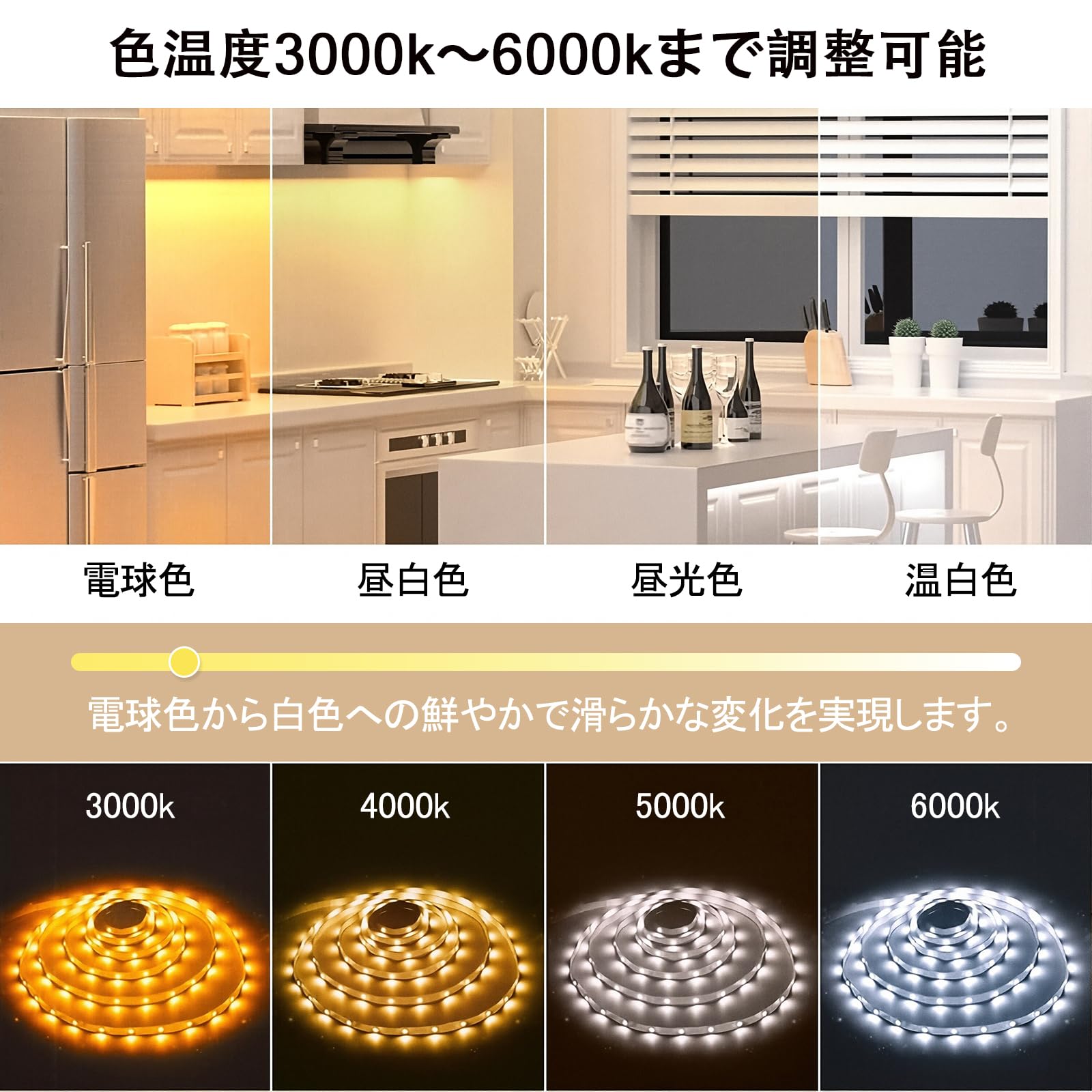 ??【多種発光モード・電球色の魅力・簡単に雰囲気を演出】調光器は不要、リモコンでLEDテープの明るさと点滅頻度を調整で、幅広く細やかな色温度3000k-6000kまで調整が行えます。?完全な白はもちろん、 白よりの電球色や微妙な昼白色、昼光色、温白色も鮮明に実現可能!??点滅モードを搭載しており、明るさ、スピード、色を自由に調整することができます。 好みや気分に合わせて自由に設定でき、生活をよりカラフルに、よりエキサイティングに演出します。(ご注意:初使用時、リモコンの絶縁シートを取り外して操作してください。)