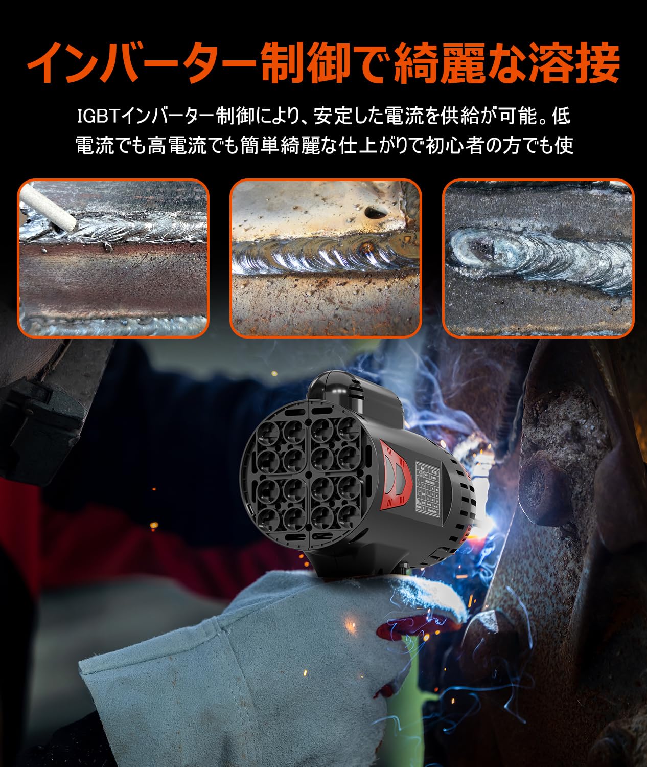 【最先端IGBTインバーター制御】アーク溶接機は最先端なIGBTインバータ制御を採用し、出力電流がスムーズに制御され、低電流でも高電流でもアークが安定になり、スパッタも少なくて、キレイな仕上がりが得られ、溶接品質が向上!それに、インバータ制御技術により、軽量化と出力・使用率の大幅アップを実現しました。持ち運びにもラクラク!