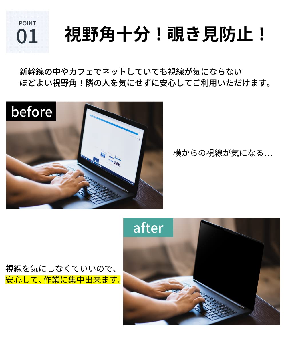 [プライバシー保護] 視野角 60度、正面から見れると画面はクリアでも、隣の席からは真っ暗に映る偏光性を有する「のぞき見防止フィルター」です。