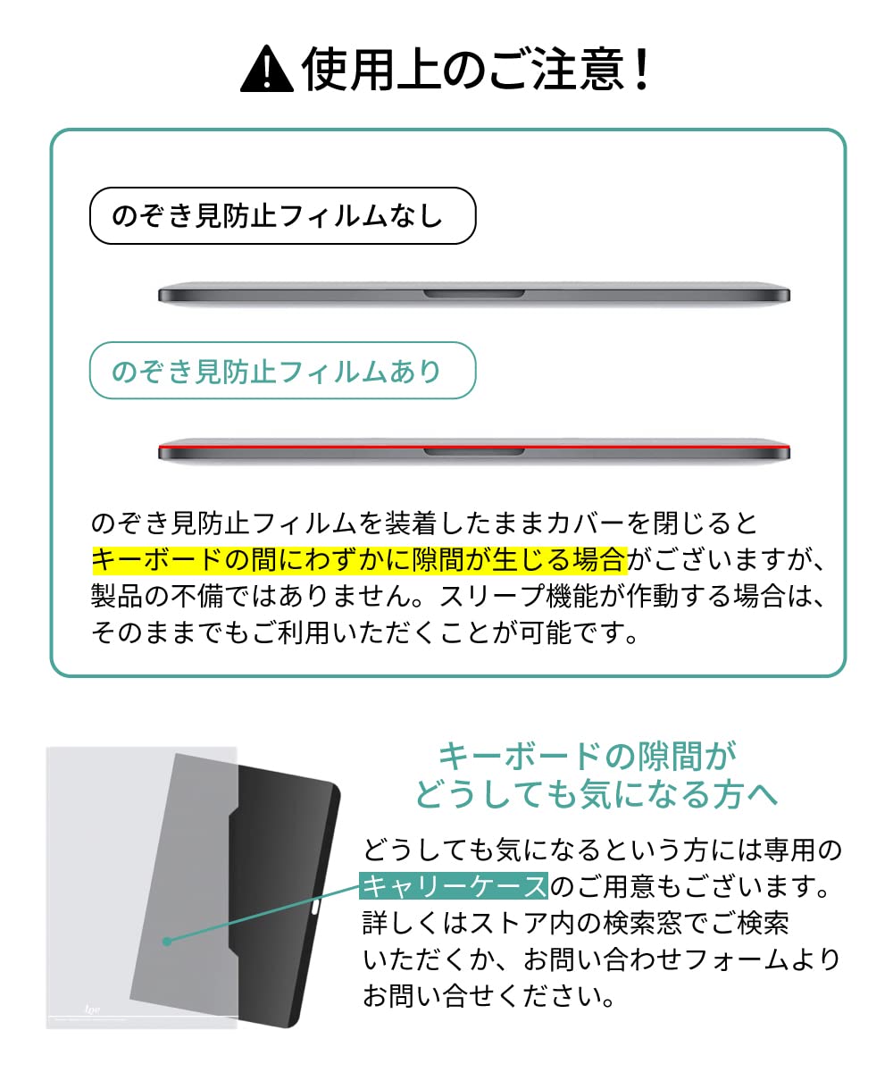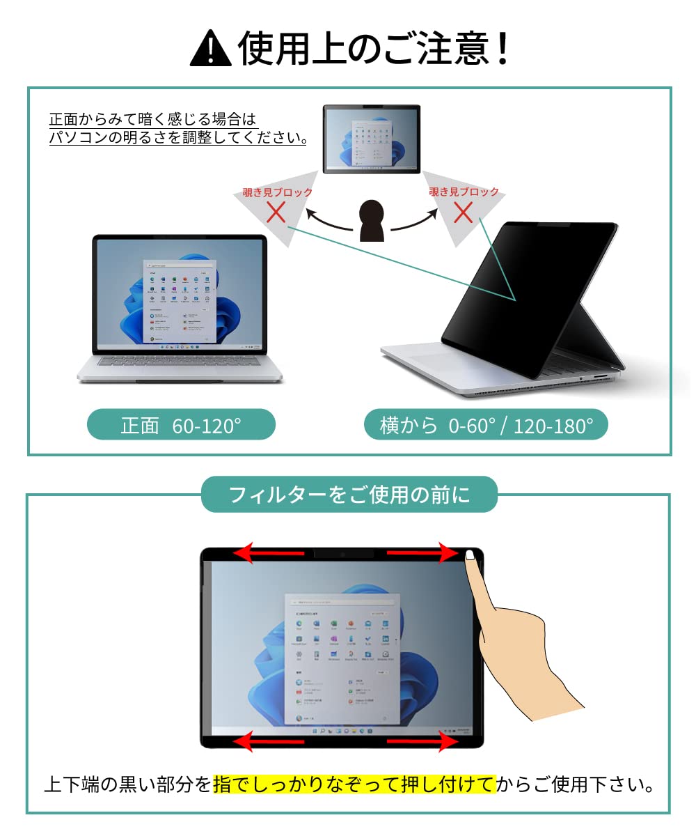 [ マグネット式 ] フィルター下側の縁マグネット吸着素材、上部にはマイクロサクション素材が備え付けられています。フィルターをスクリーンに合わせて上と下をそっと指でなぞるだけで簡単に装着ができます。家ではフィルターを外し、外出先ではフィルターを付けてといった気軽な使い方ができるフィルターです。 ※ご注意ください※ アンチグレアフィルムやガラスフィルムとの重ね合わせは推奨していません。ご使用中のフィルムをはがしていただくかフッ素コーティングが施されていない グレアフィルムのご利用をご検討ください。