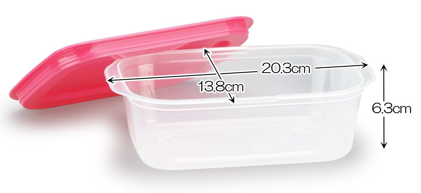 角型なので冷蔵庫の端にもムダなく納まる。中身が見える透明容器で横からでも中身の確認が容易。