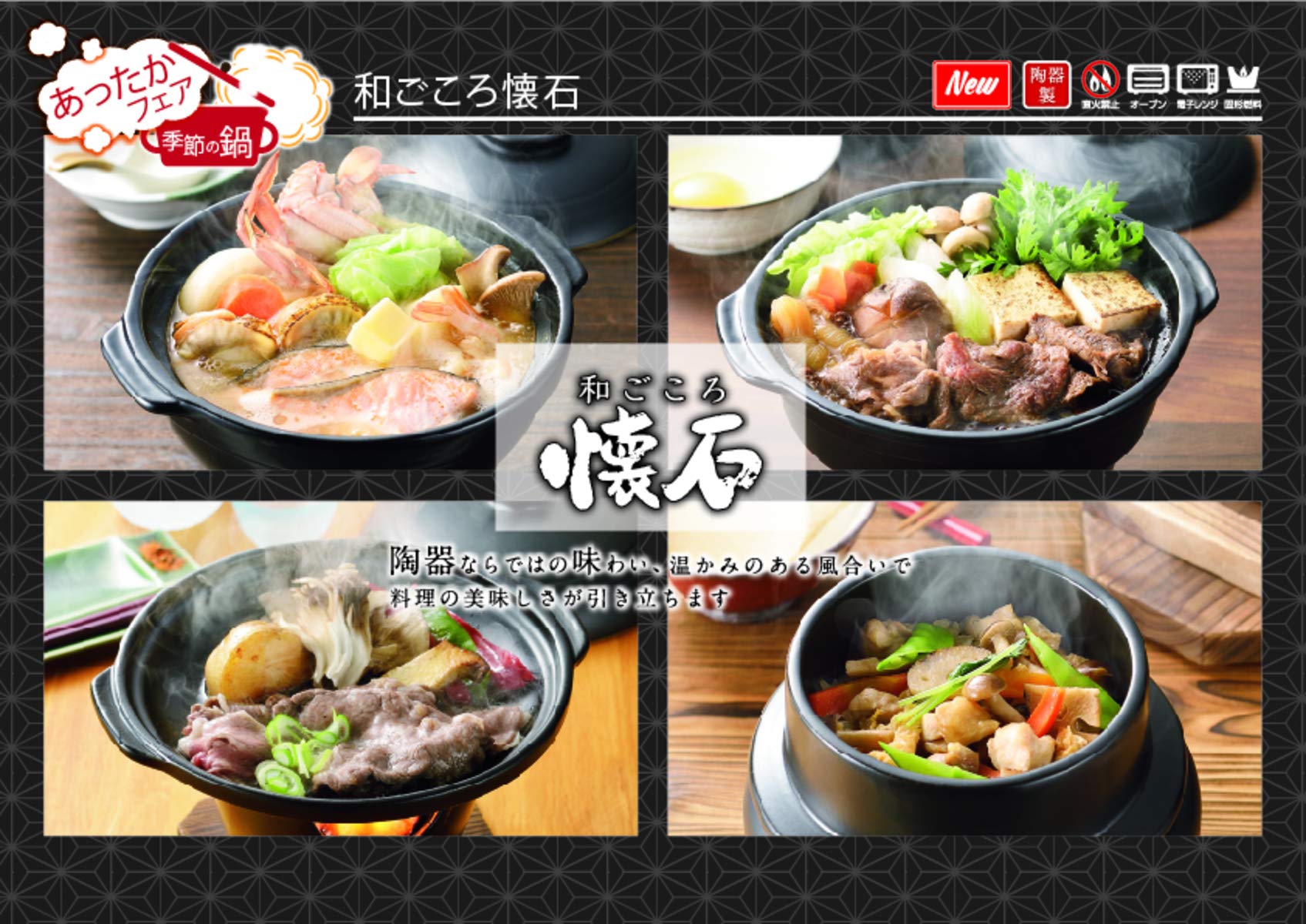 生産国:中国、※オーブン・電子レンジOK(本体のみ)、※直火禁止、※固形燃料OK