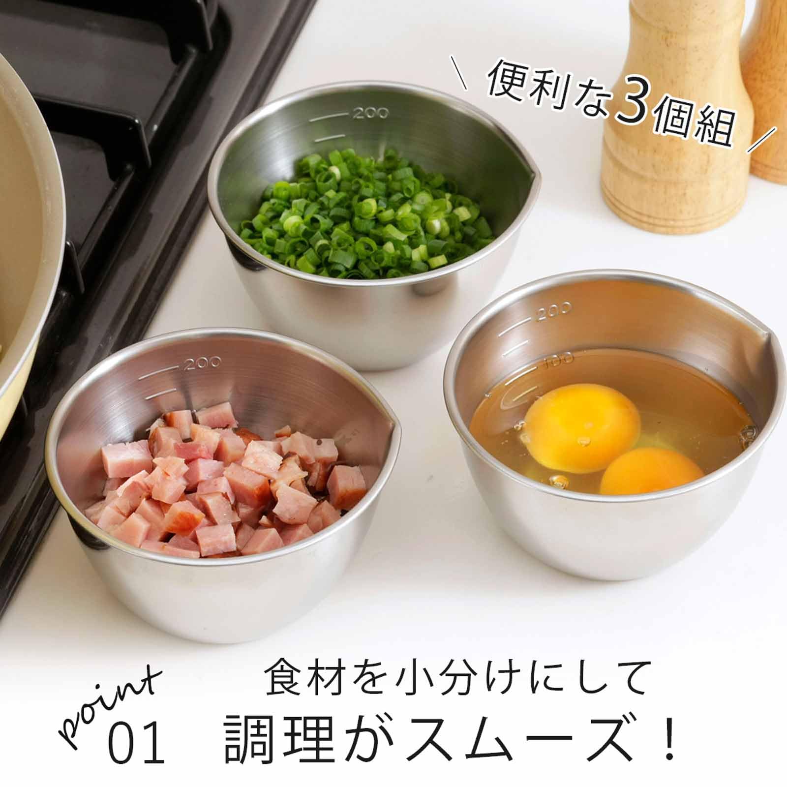 下村企販 ボウル 270ml 3個組 【日本製】 注ぎ口付き 目盛付き 食洗機対応 下ごしらえに便利 小分け ボール 容器 ステンレス 28867 燕三条