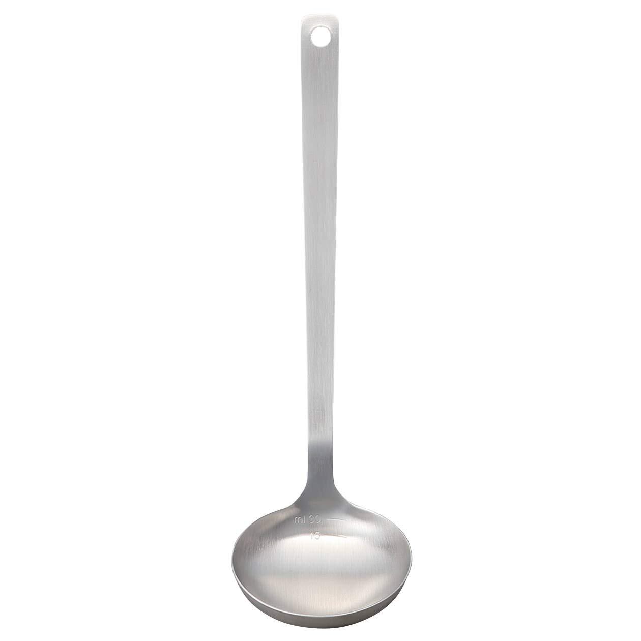 お玉の内側に目盛がついていて、調理時に便利です。引出などに収納してもかさばらないよう、柄を平らにしました。