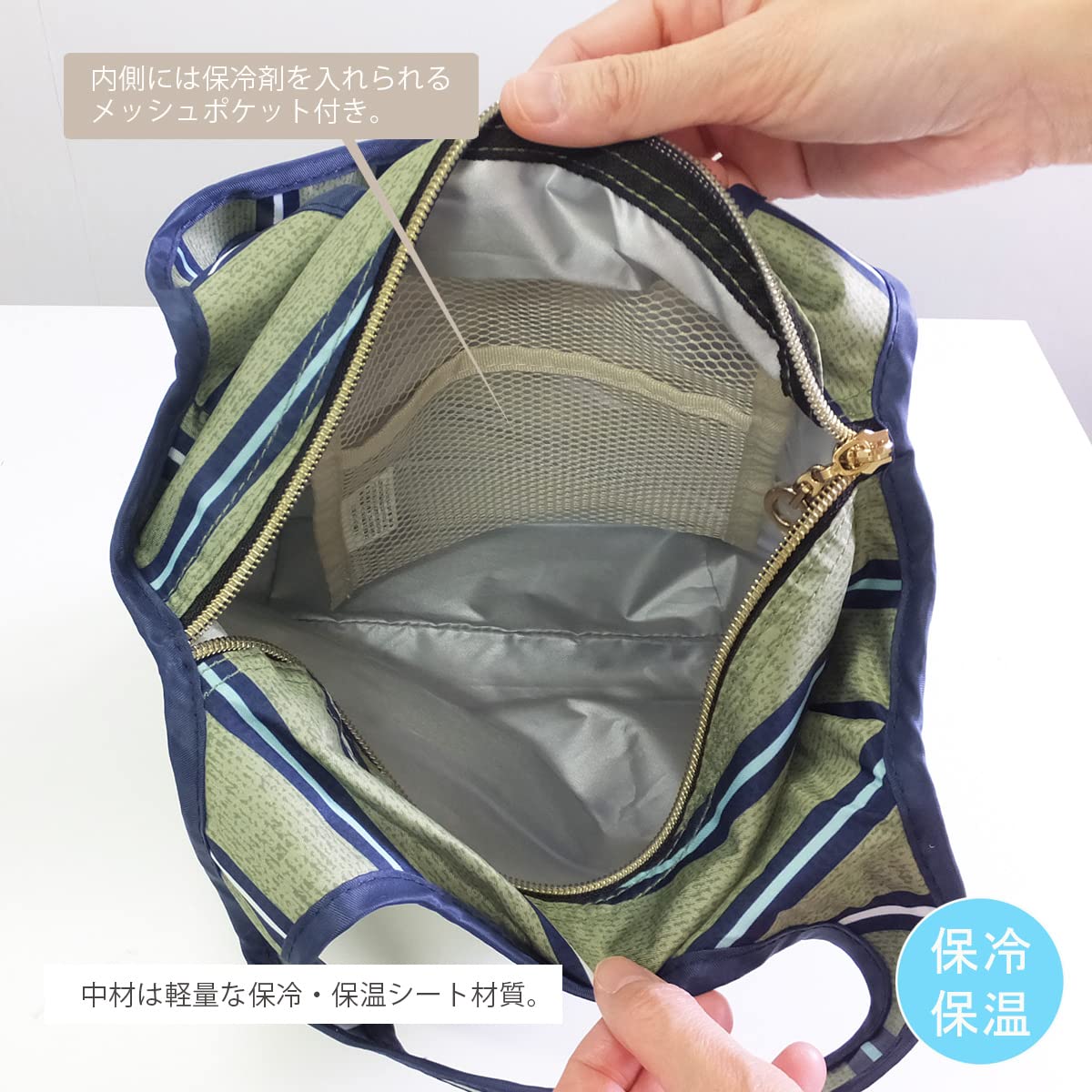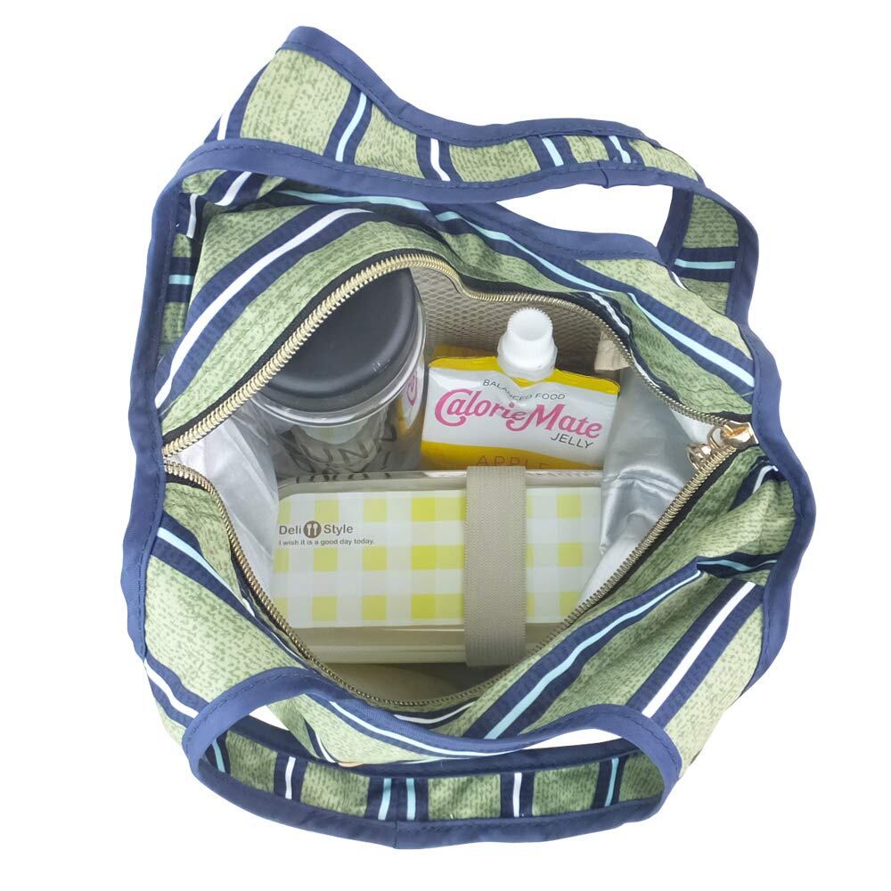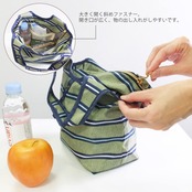 お弁当も安心の保冷保温仕様。保冷材などをいれることのできるメッシュポケット付きです。お弁当と一緒にマグボトルやペットボトル、お財布なども一緒に入れられます。