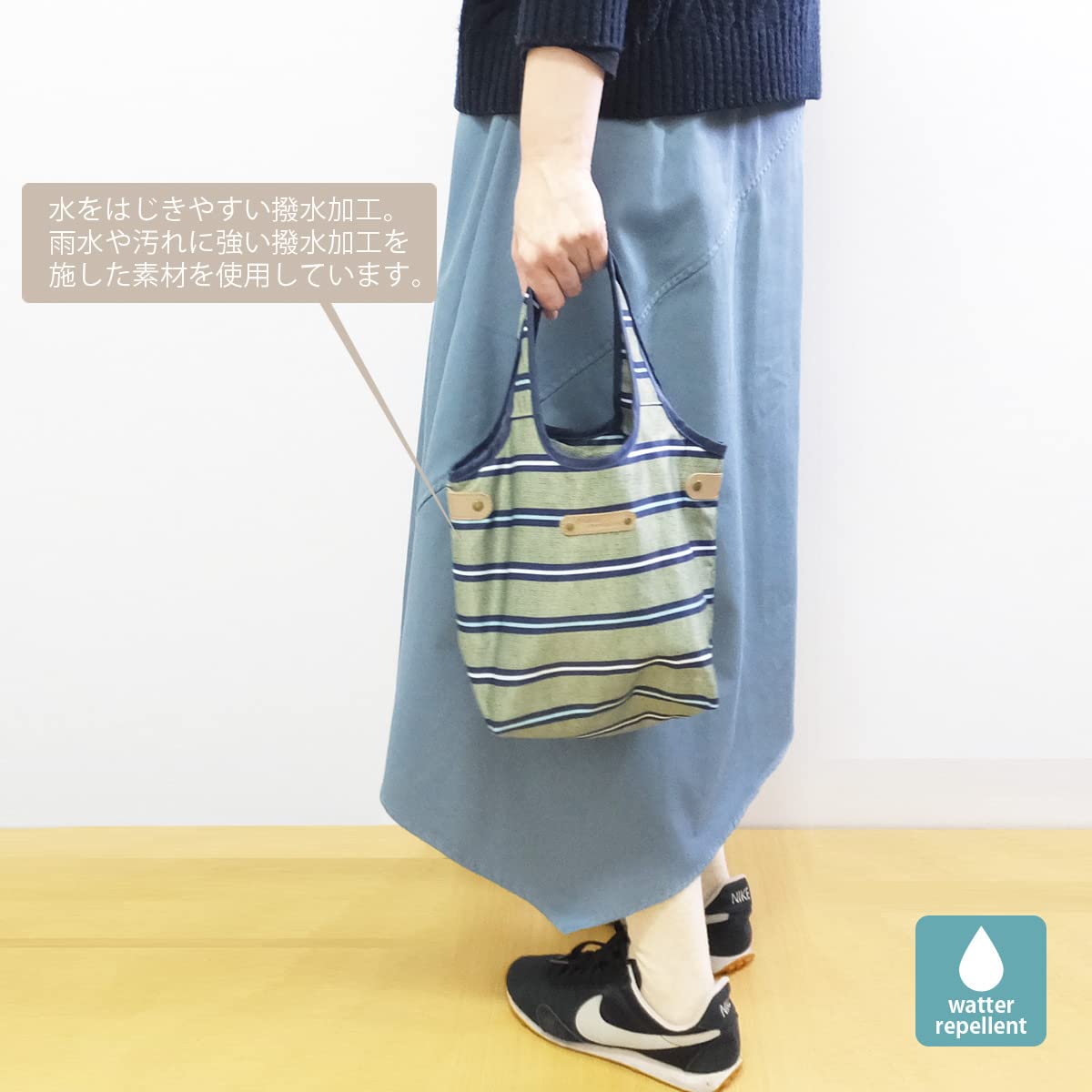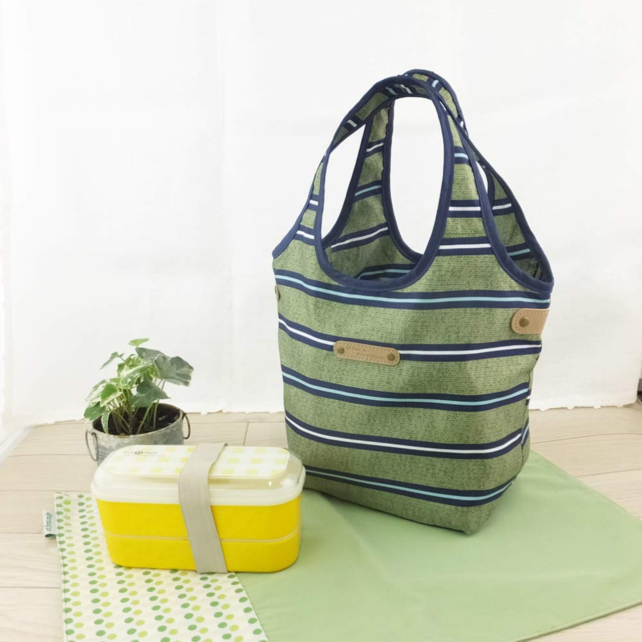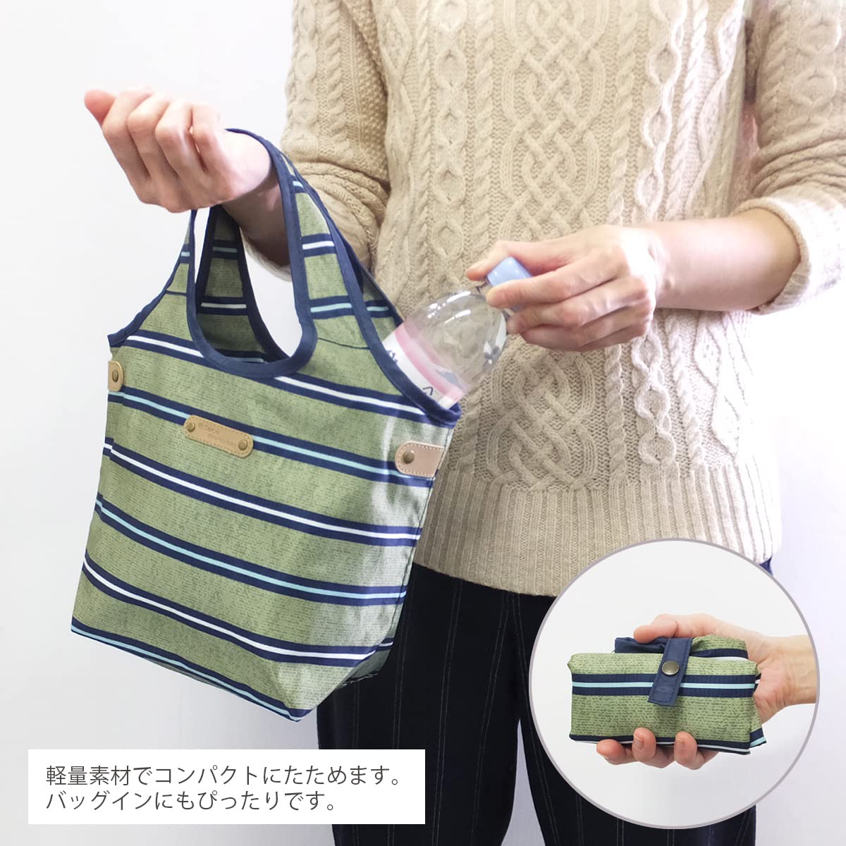 コンパクトに折りたためるので、バッグインして持ち歩くのにちょうどいいサイズです。ランチタイムだけでなく、小さめのエコバッグとして、また、サブバッグとしても便利にお使い頂けます。