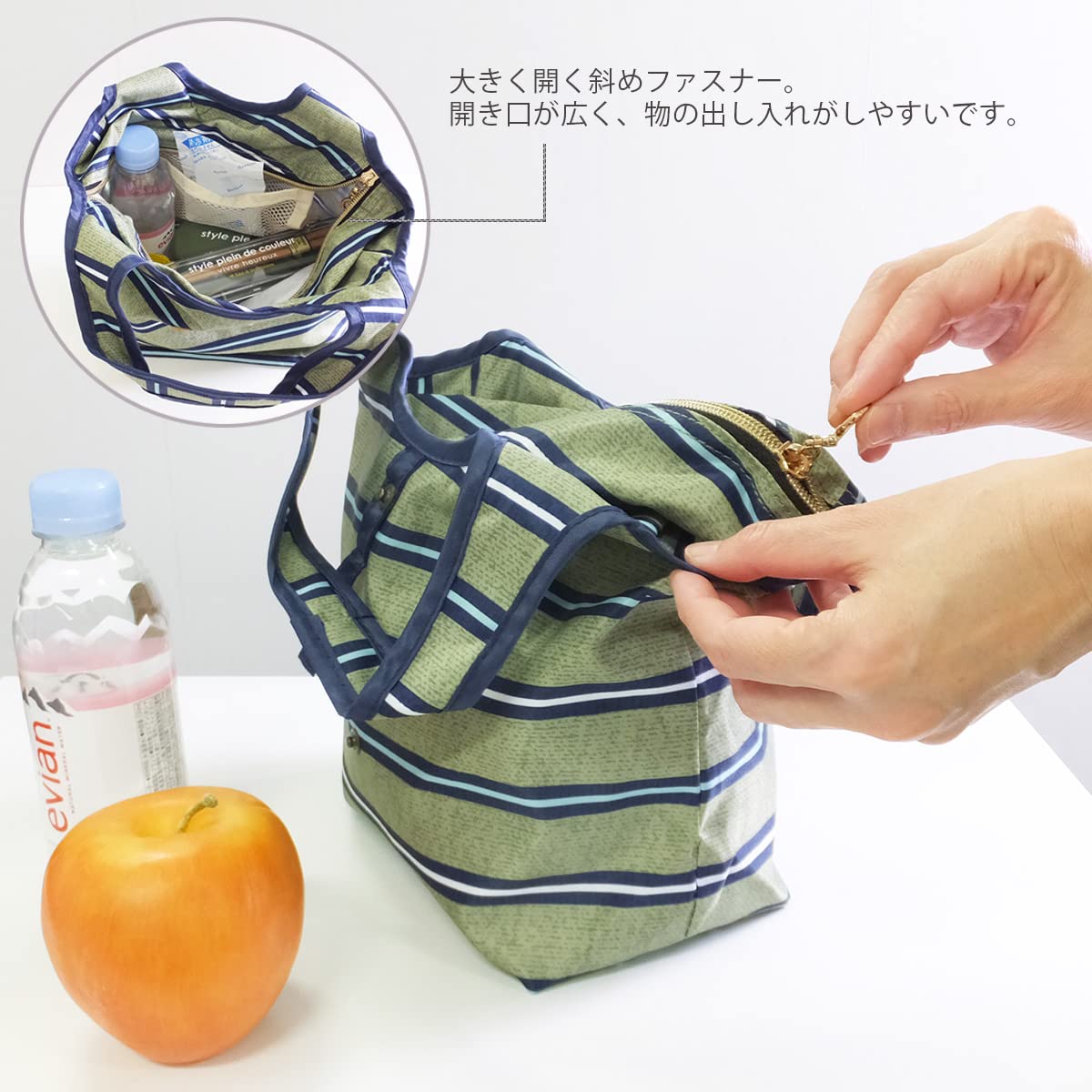 お弁当と一緒にマグボトルやペットボトル、お財布なども一緒に入れられます。