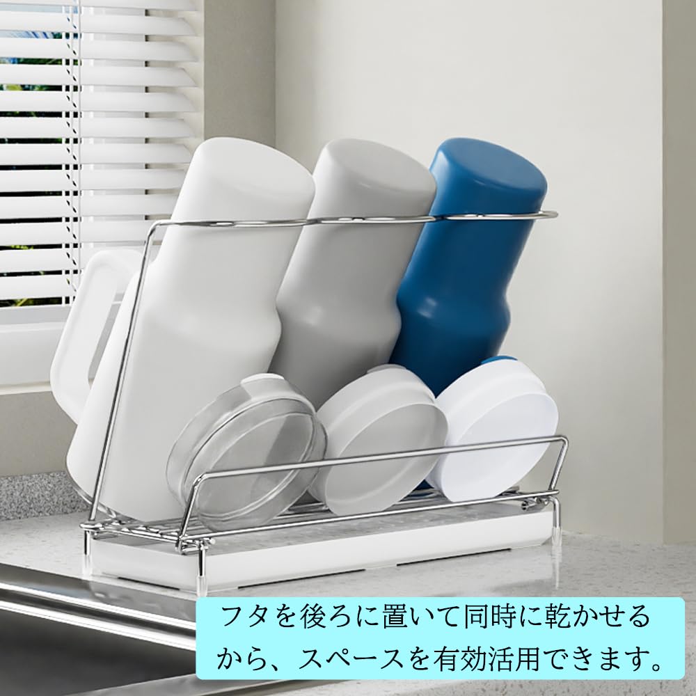 ボトルスタンド 水筒水切り ジャグボトルスタンド 折りたたみ式 ステンレス製 シンク周り収納 コップ置き 水筒干し 水切りトレイ付き 食洗機対応 コンパクト 斜めに立てかける