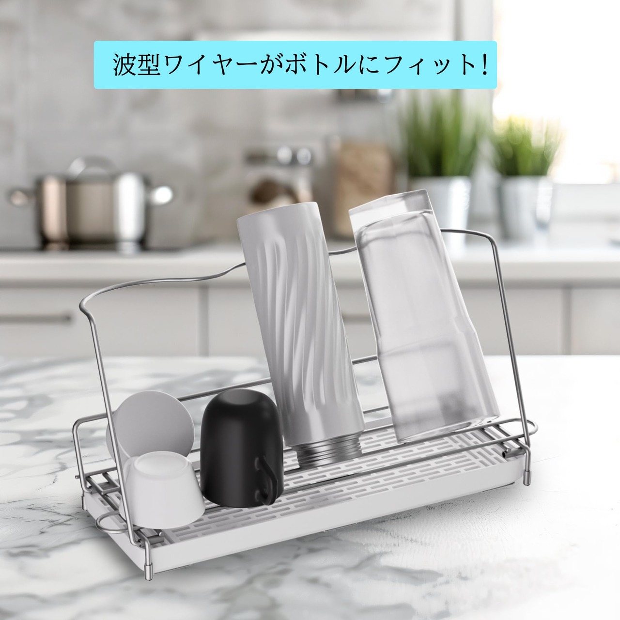 【波型ワイヤーがボトルにフィット】波型のカーブ部分がボトルを優しく支えます。ピタッとフィットして安定感を高めてくれます。