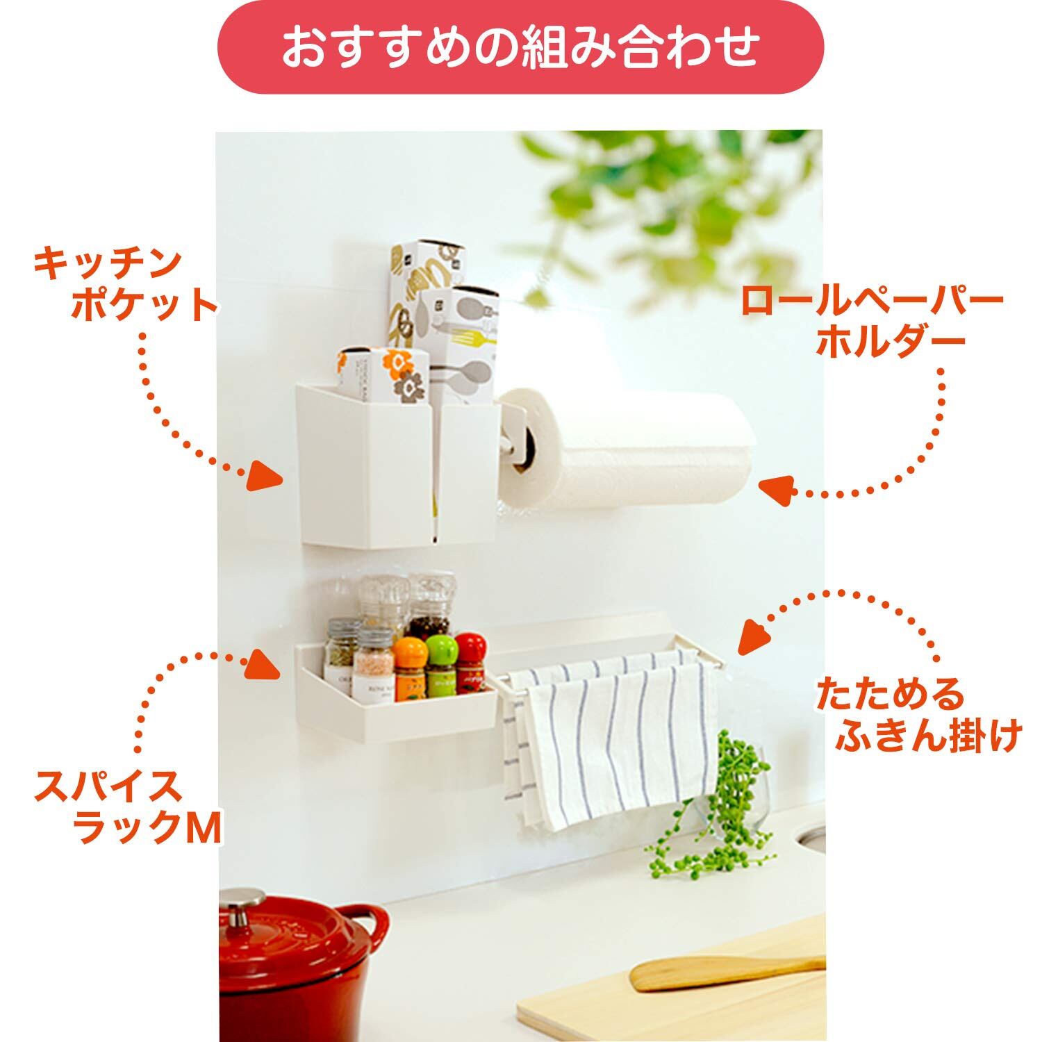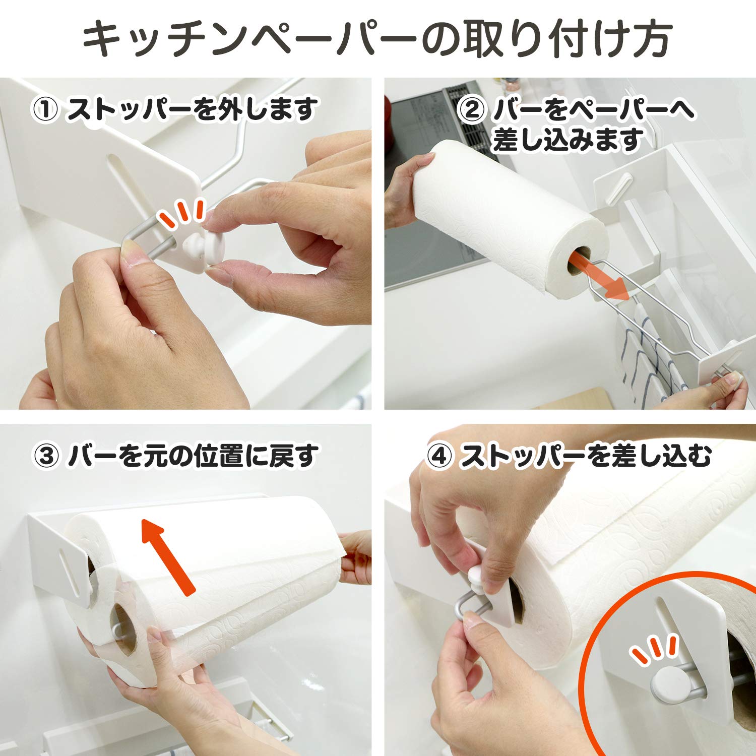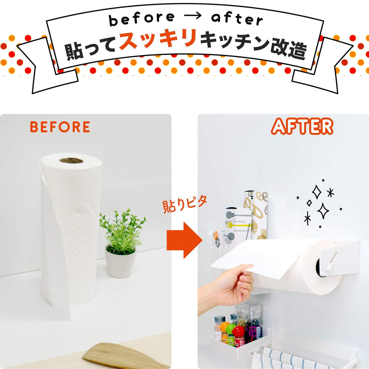 キッチンの壁にキレイに貼れるロールペーパーホルダーです。