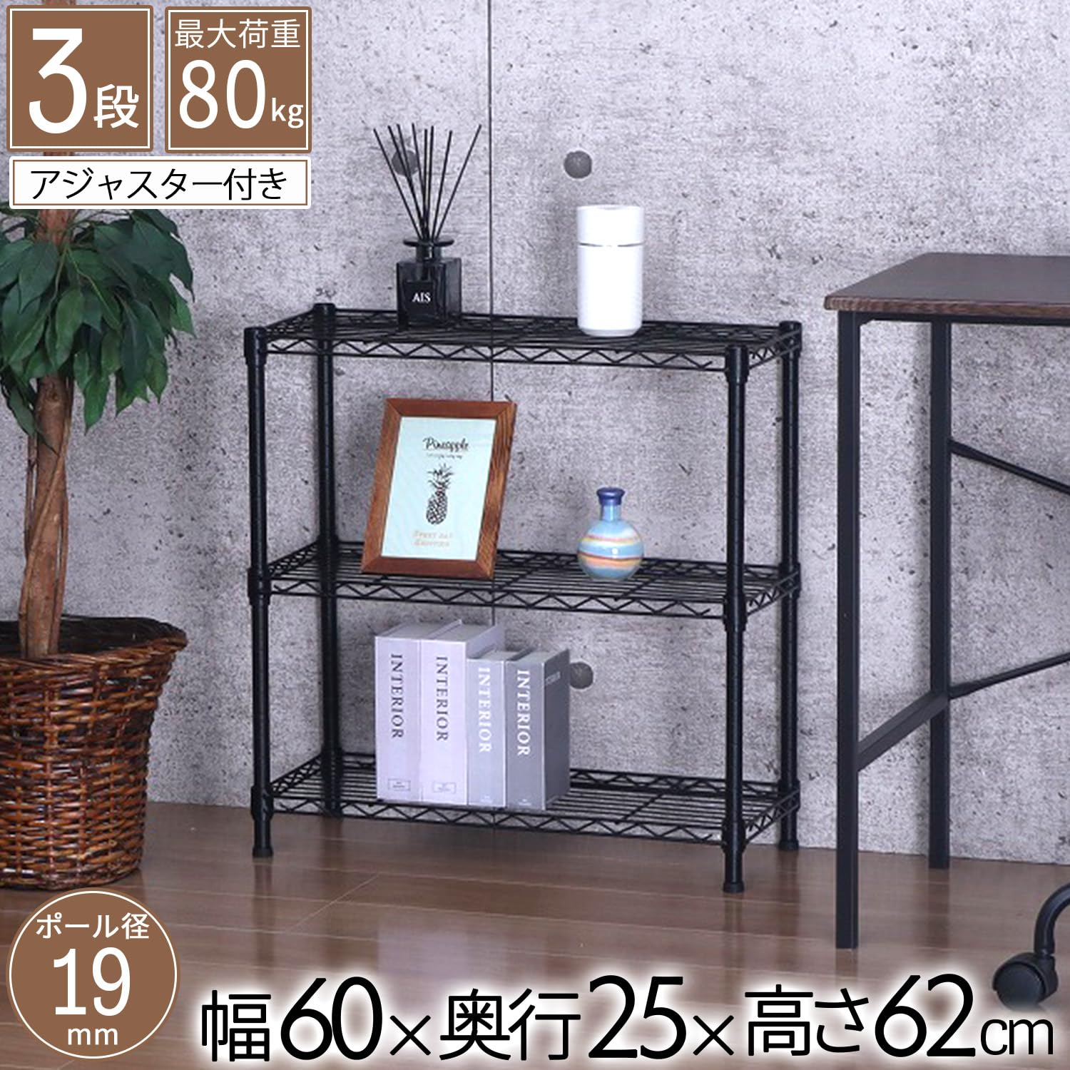 エイアイテック(AITECH) AIS スチールラック 3段 支柱径19mm 幅60cm 奥行25cm 高さ62cm ブラック NERO-6025 BK