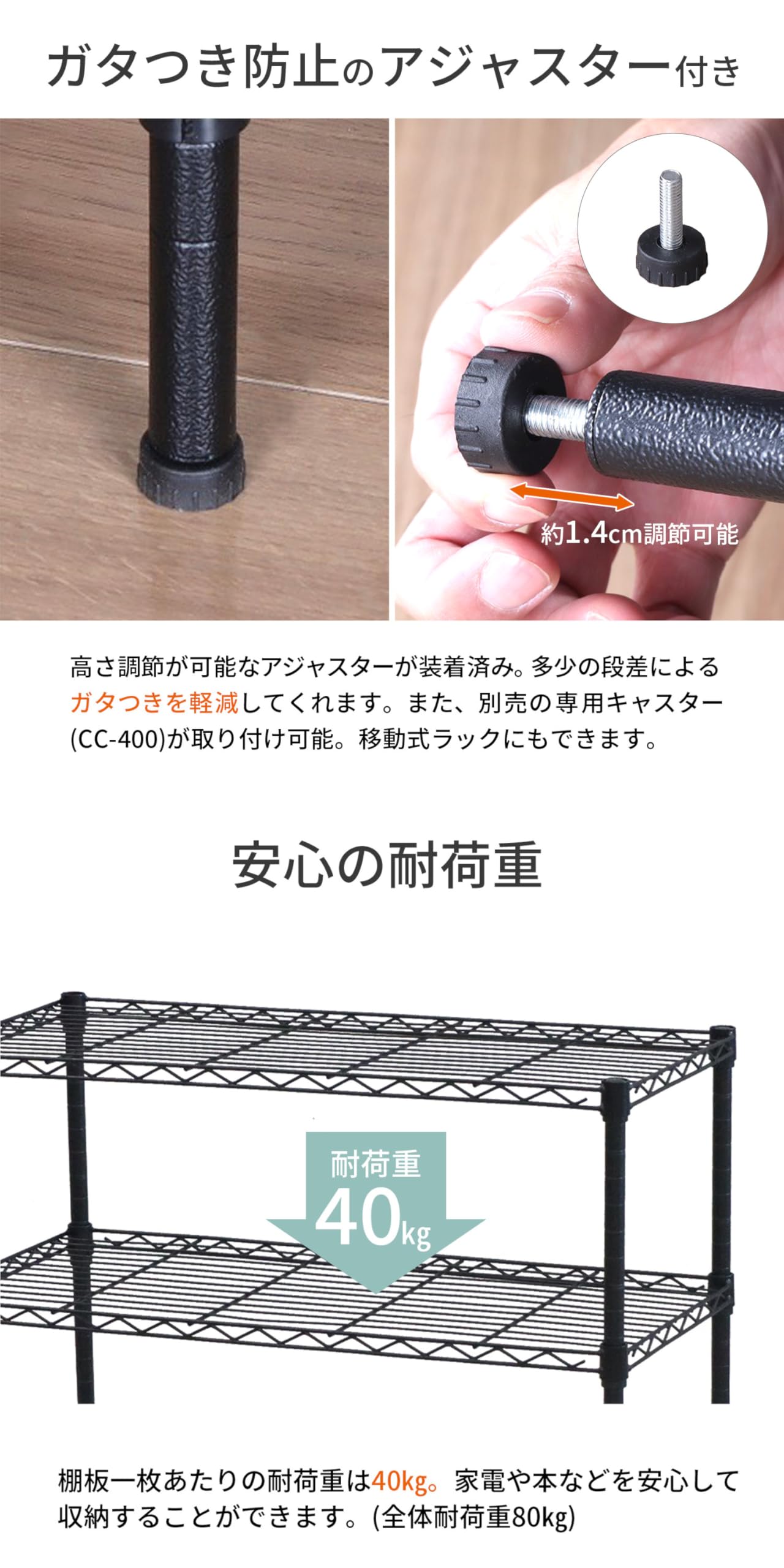 ・棚板1枚あたりの耐荷重は40kgあり、家電や調理器具、食品なども安心して収納することができます。
