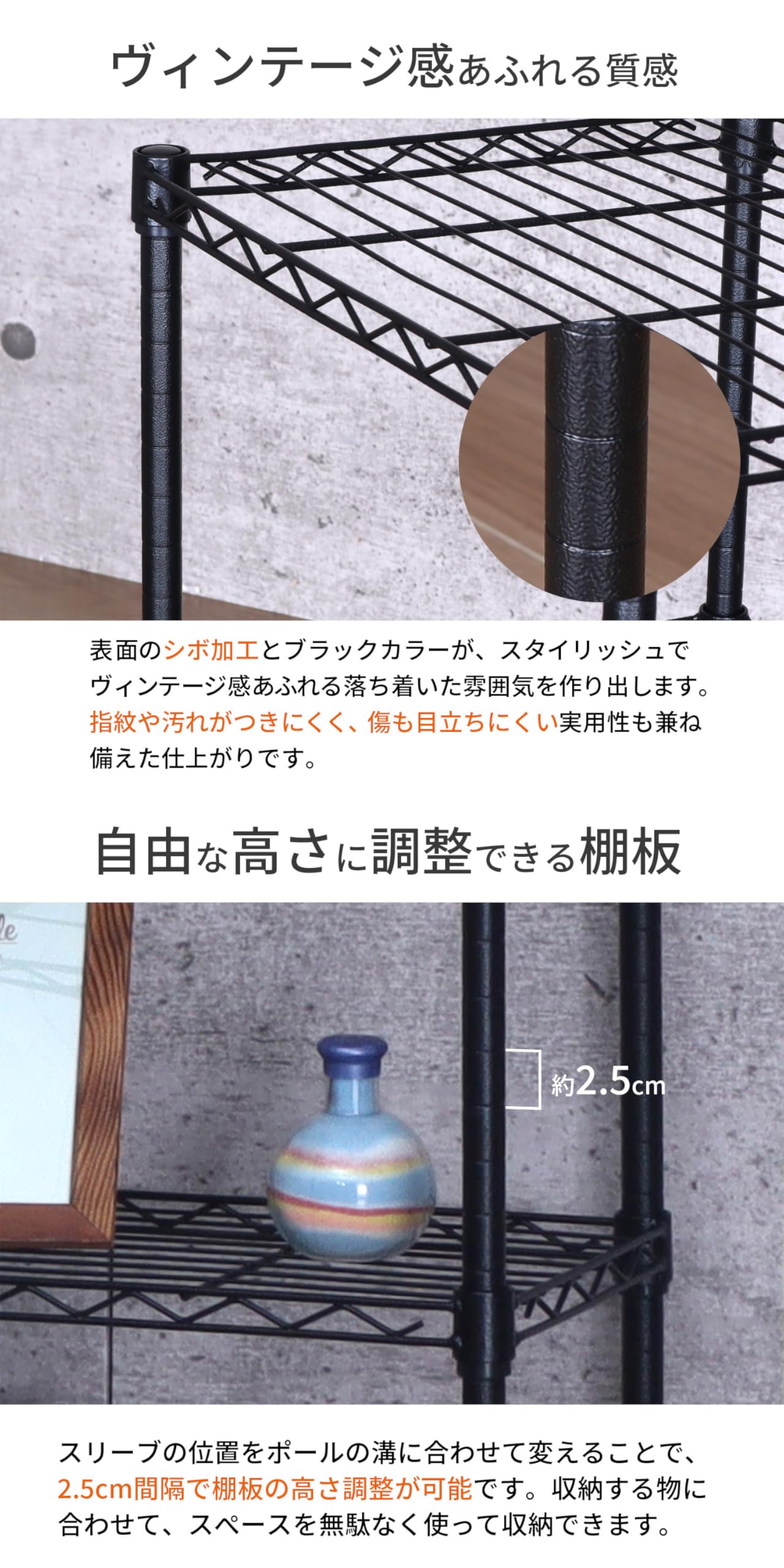 ・棚板は、約2.5cm間隔で高さ調整が可能。収納する物や用途に合わせて高さの調整ができるので、ラック内のスペースを無駄なく使って収納することができます。