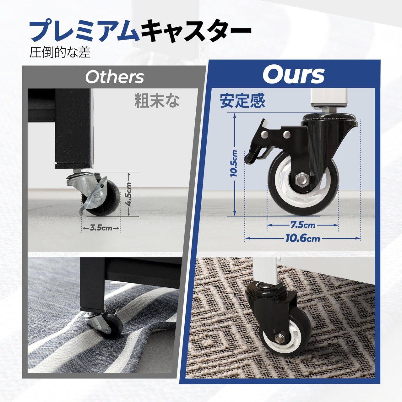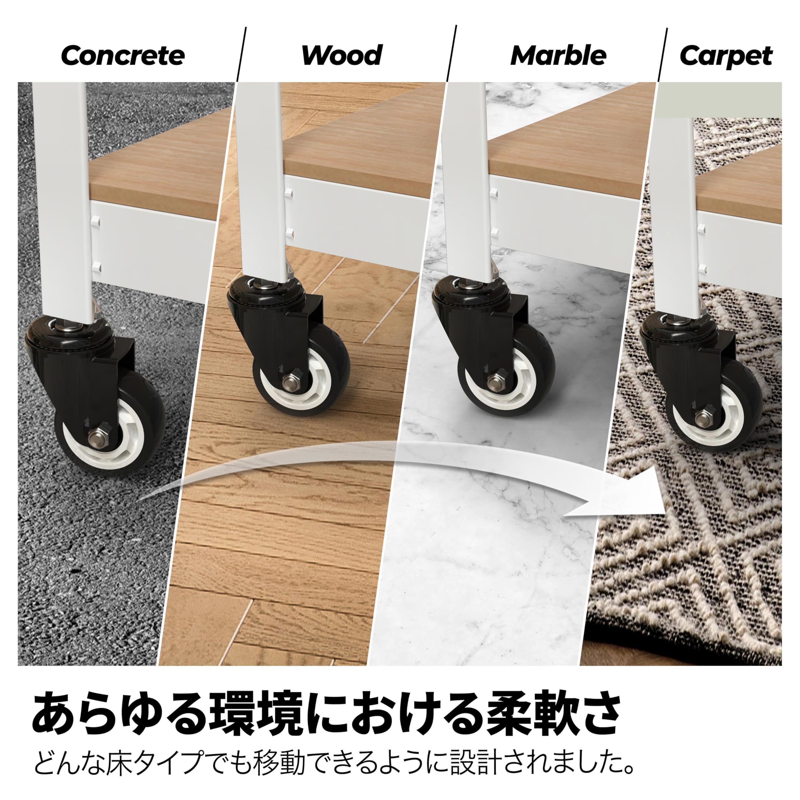 高耐荷重のプレミアムキャスター:屋内外で使用できる様々な用途と手軽な移動性をご体験ください。このキャスターはキッチン、オフィス、リビング、ベランダ、でよく使うワゴン、作業台、家具、棚など、様々な用途に適しています。耐摩耗性PVCキャスターは、安定性が高いため、高強度及び頻繁な日常的な使用に適しています。キャスター棚の総容量は140kgで、スタンド棚の総容量は400kgです。