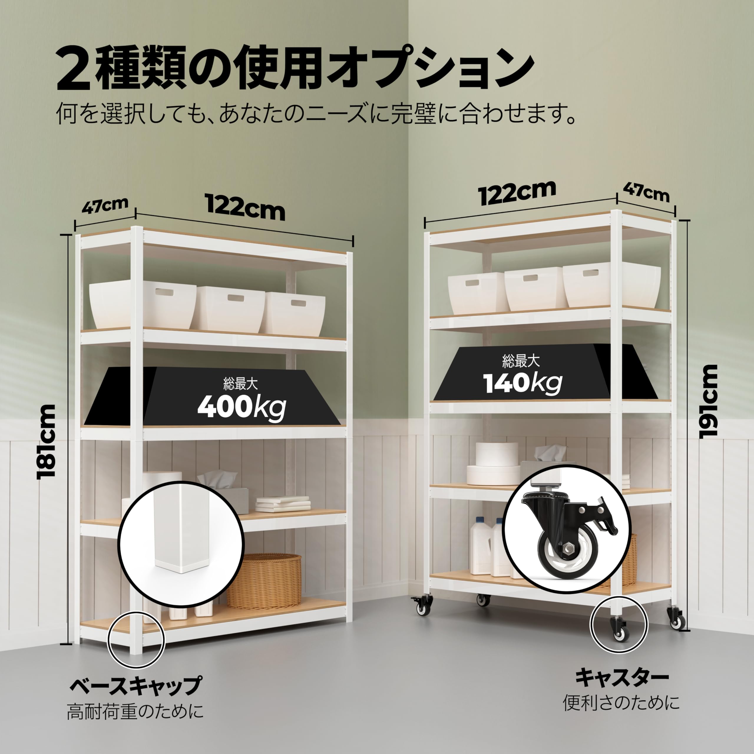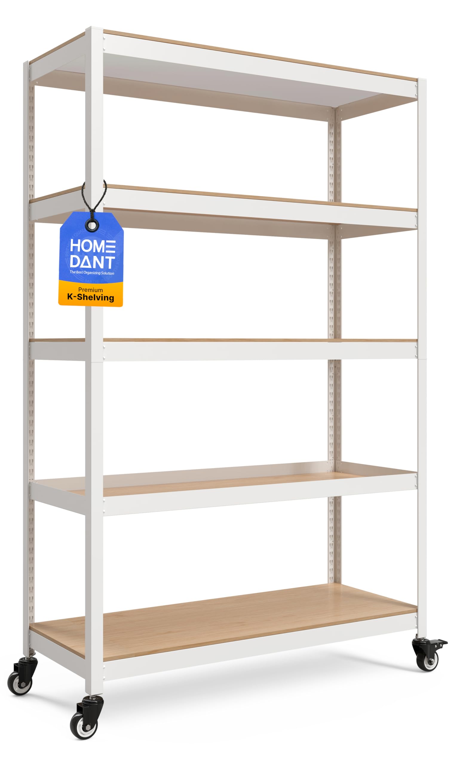HOMEDANT House 組立簡単 ラミネート スチールラック キッチン 5段 幅120 奥行45 高さ191 ホワイト キャスター付き ホームダント 車輪 調整可能 棚 収納棚 メタルラック 倉庫 ガラージ オフィス 業務用