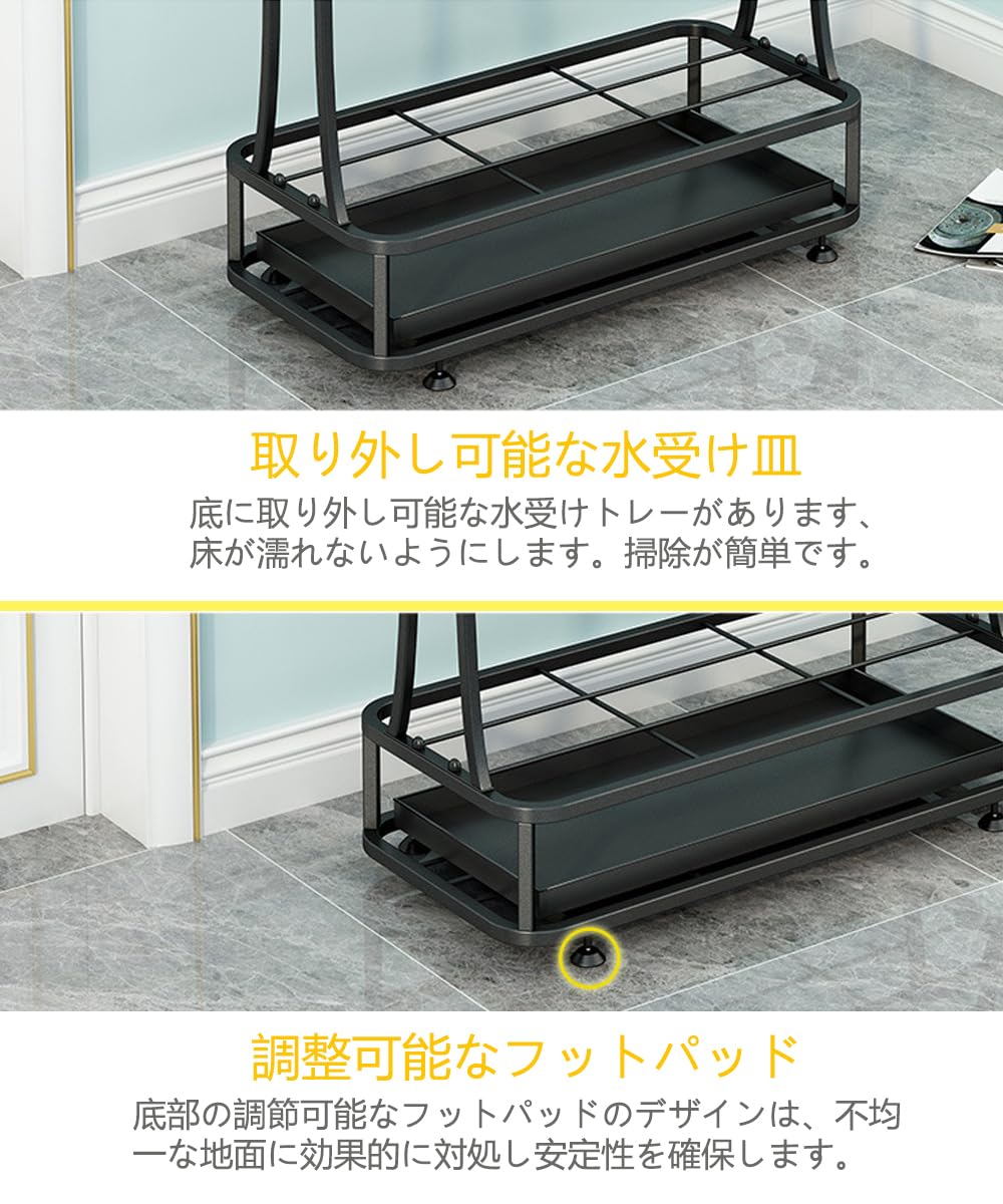 【水受け皿付き】底に取り外し可能な水受けトレーがあります。傘から残した水を集めて、床が濡れないようにします、便利に掃除してください。傘立ての組み立ては非常にシンプルで、一人でも簡単にできます。