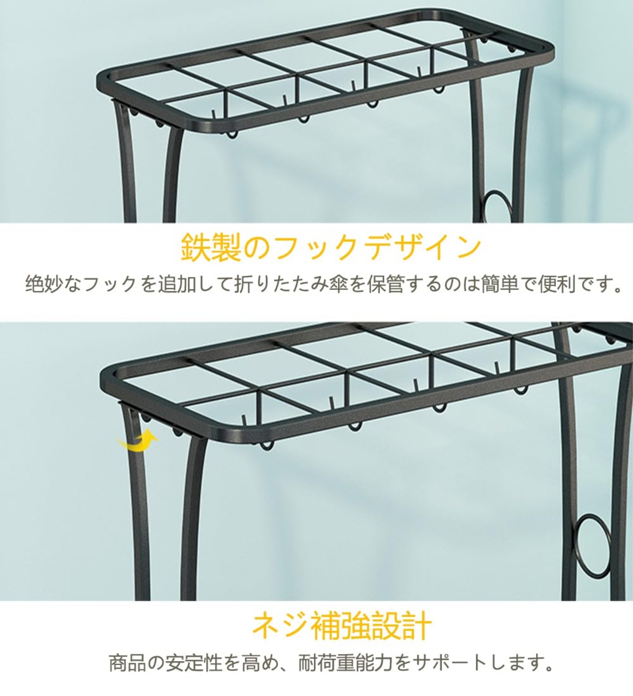 【大容量の傘立て】傘立ては丈夫で長持ちする鉄の材料で作られています。外層の焼付塗装工芸は、防水、錆び防止ができます。堅固な構造と四つの滑り止めマットで、より多くのものをしっかりと収納できます。